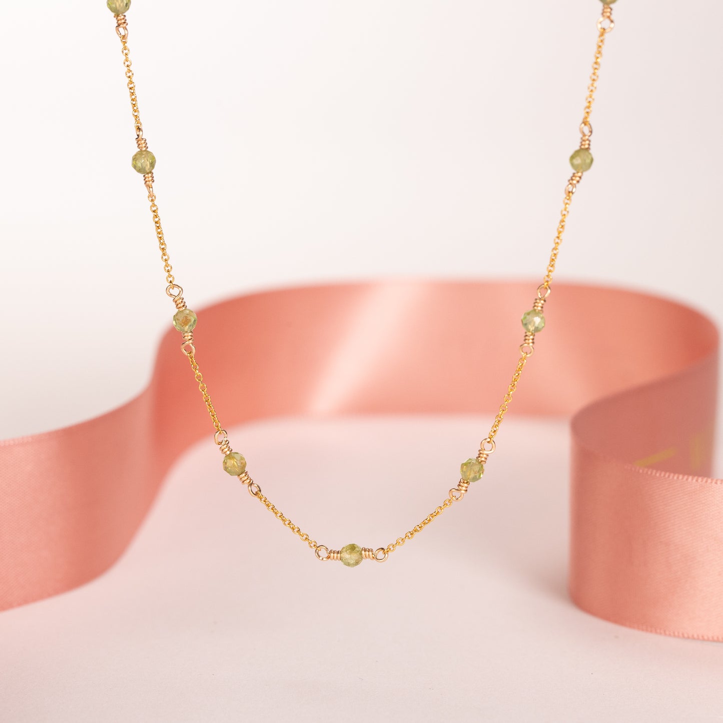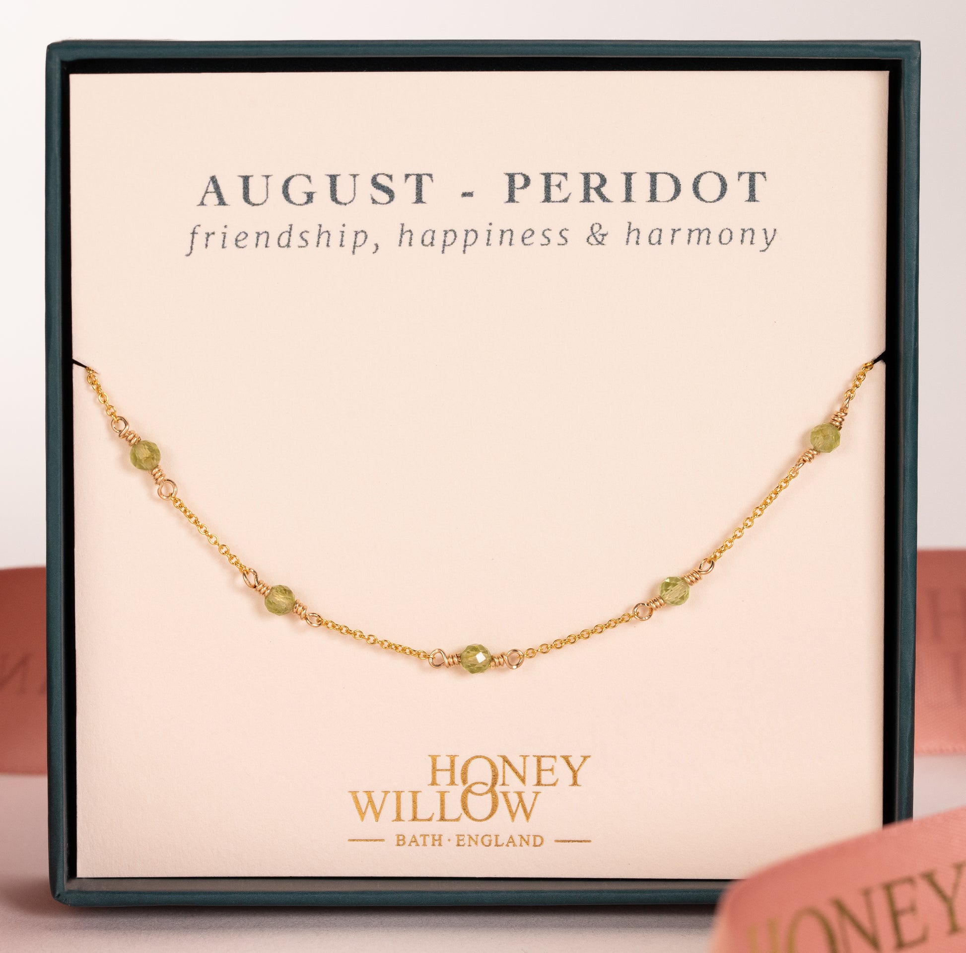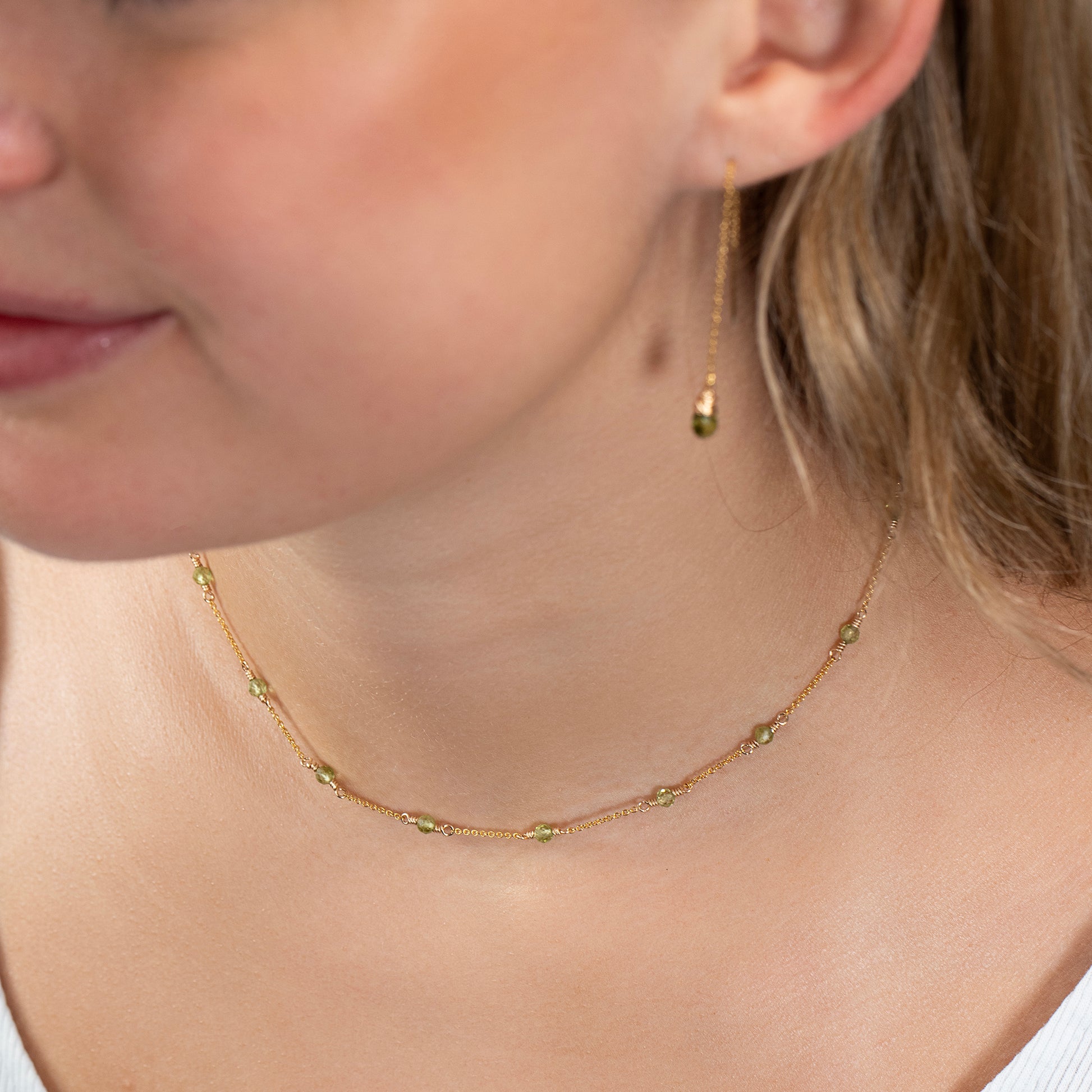 Celebrate her August birthday with a delicate satellite necklace handmade with tiny birthstones hand-wired into the chain. The necklace is worn short, like a choker and is perfect for layering.