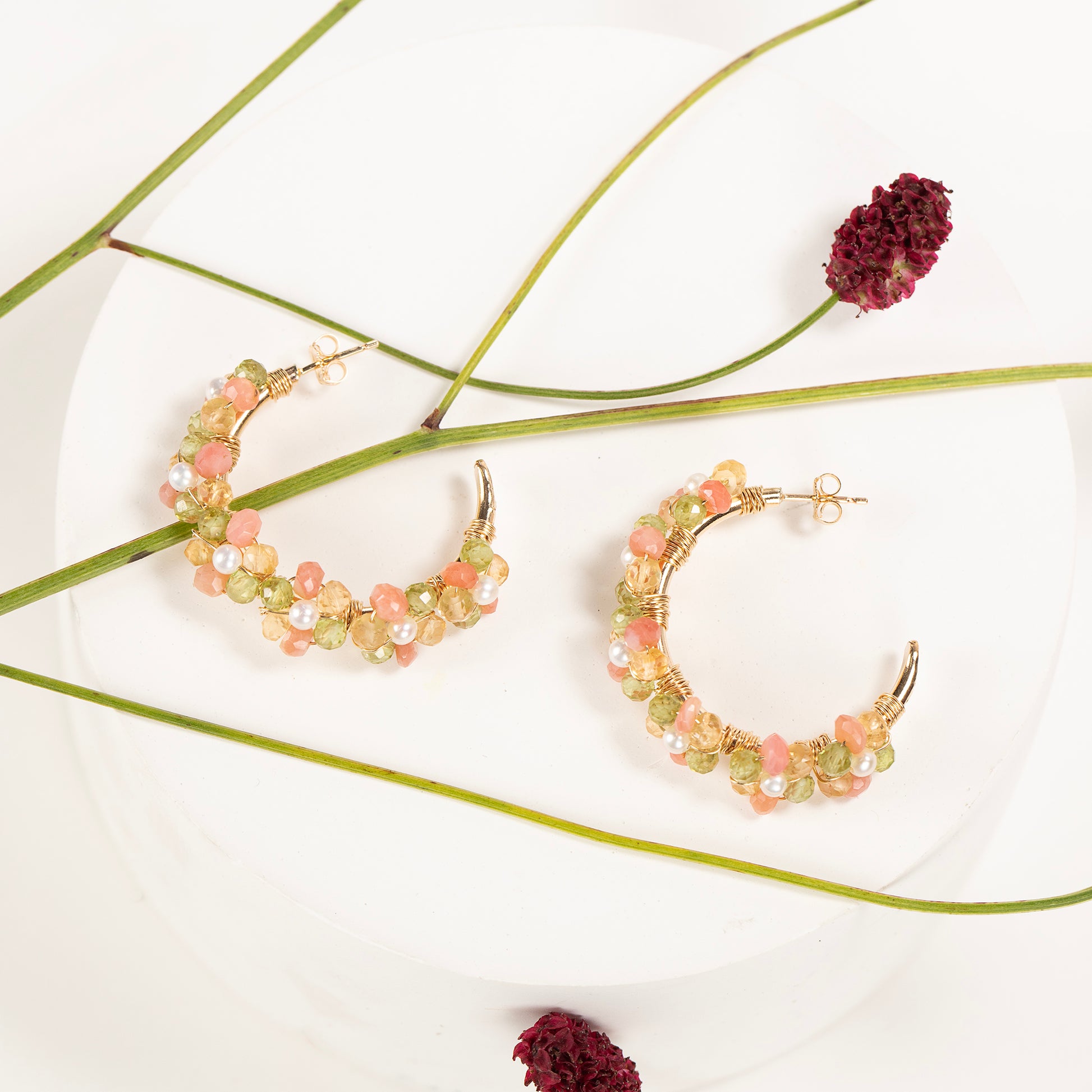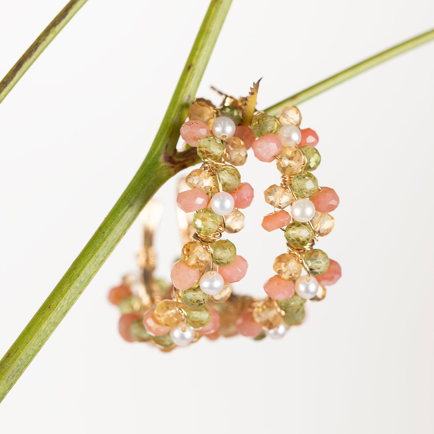 These gemstone hoops are made with citrine, pink opal, peridot and freshwater pearls. Please note these are natural stones, which vary in size and shade