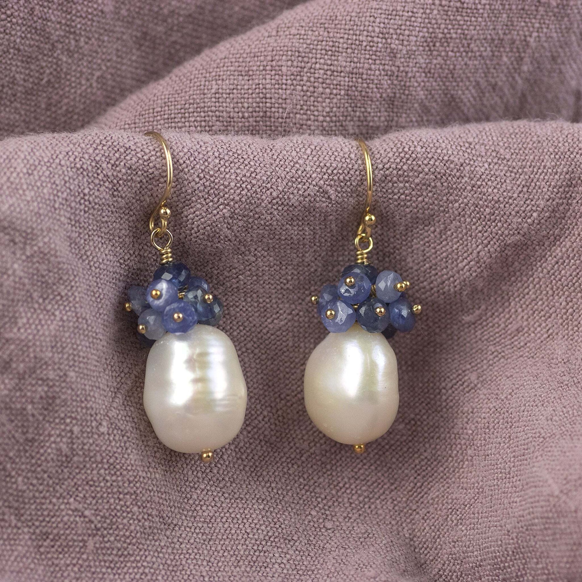 These unique earrings are handmade to order with baroque freshwater pearls, topped with a cluster of birthstones.