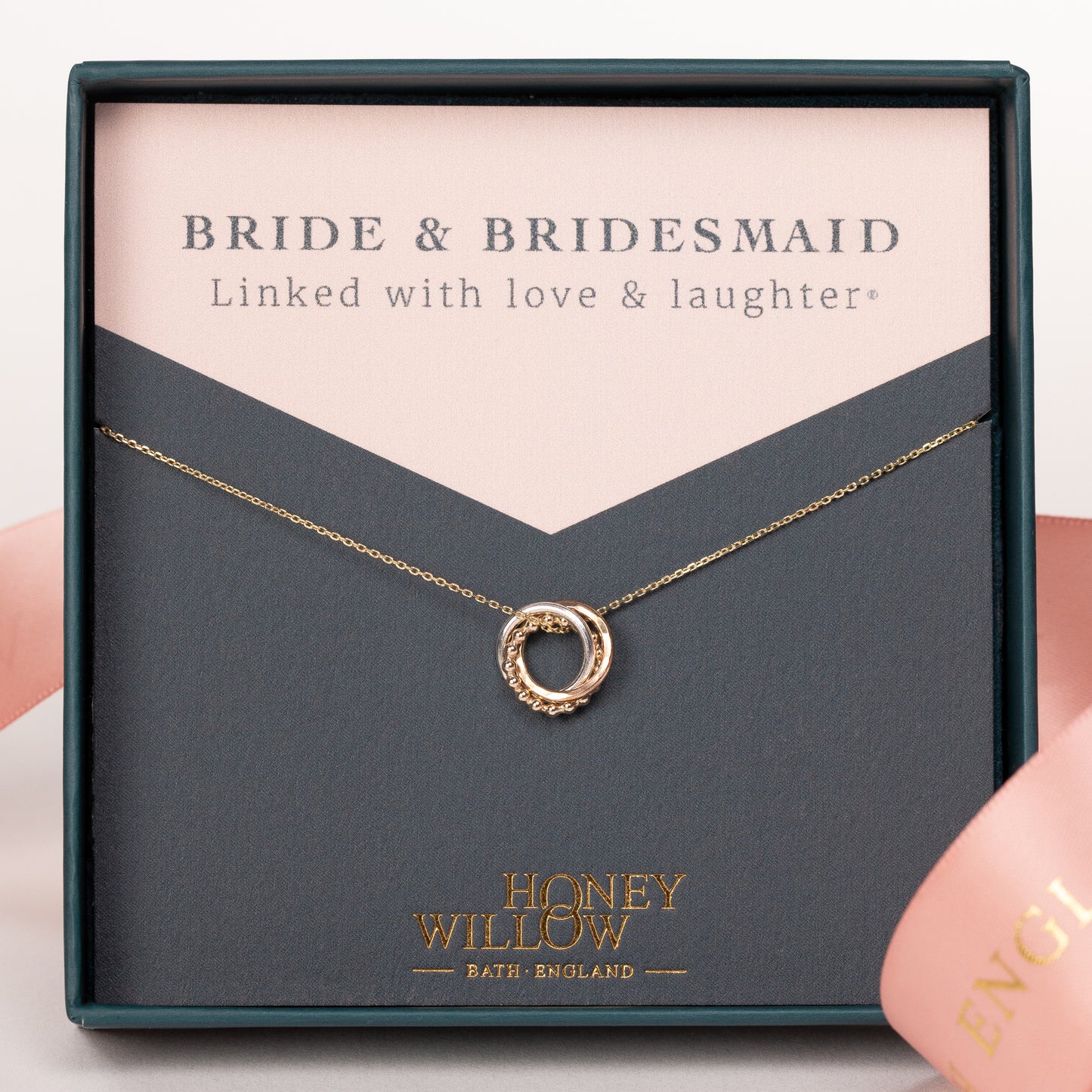 Celebrate the bonds between bride and two bridesmaids, with a dainty 9kt yellow gold, rose gold and silver love knot necklace.