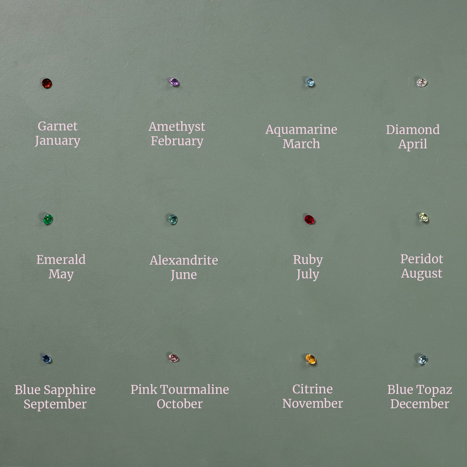 Image 3 shows the birthstones we use. Please note that the diamond is lab-grown. A lab-grown diamond is made from the same material as a mined diamond, but without the ethical and environmental problems.