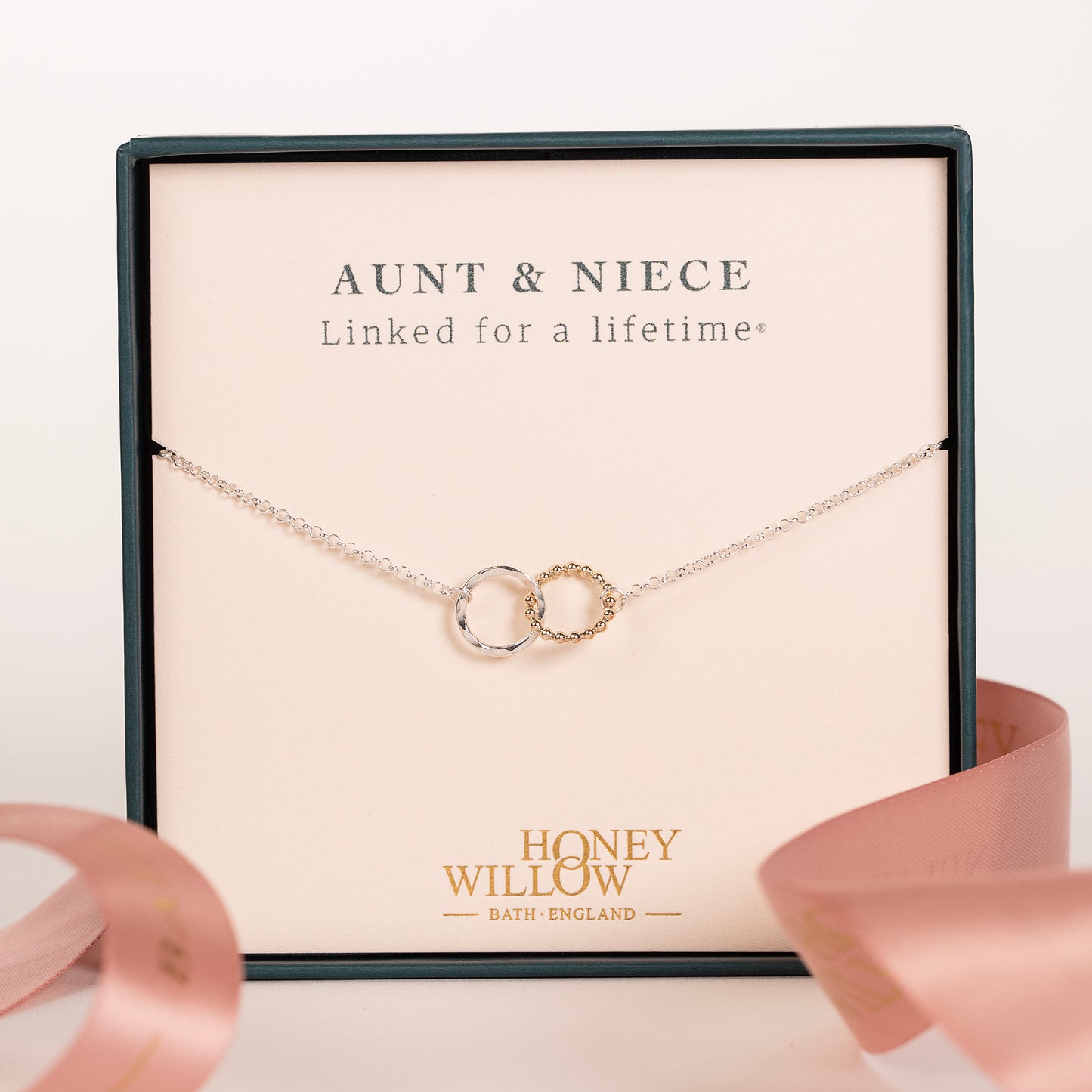 Celebrate the bond between aunt and niece with a dainty 9kt gold and silver necklace, symbolising that you are linked for a lifetime®.