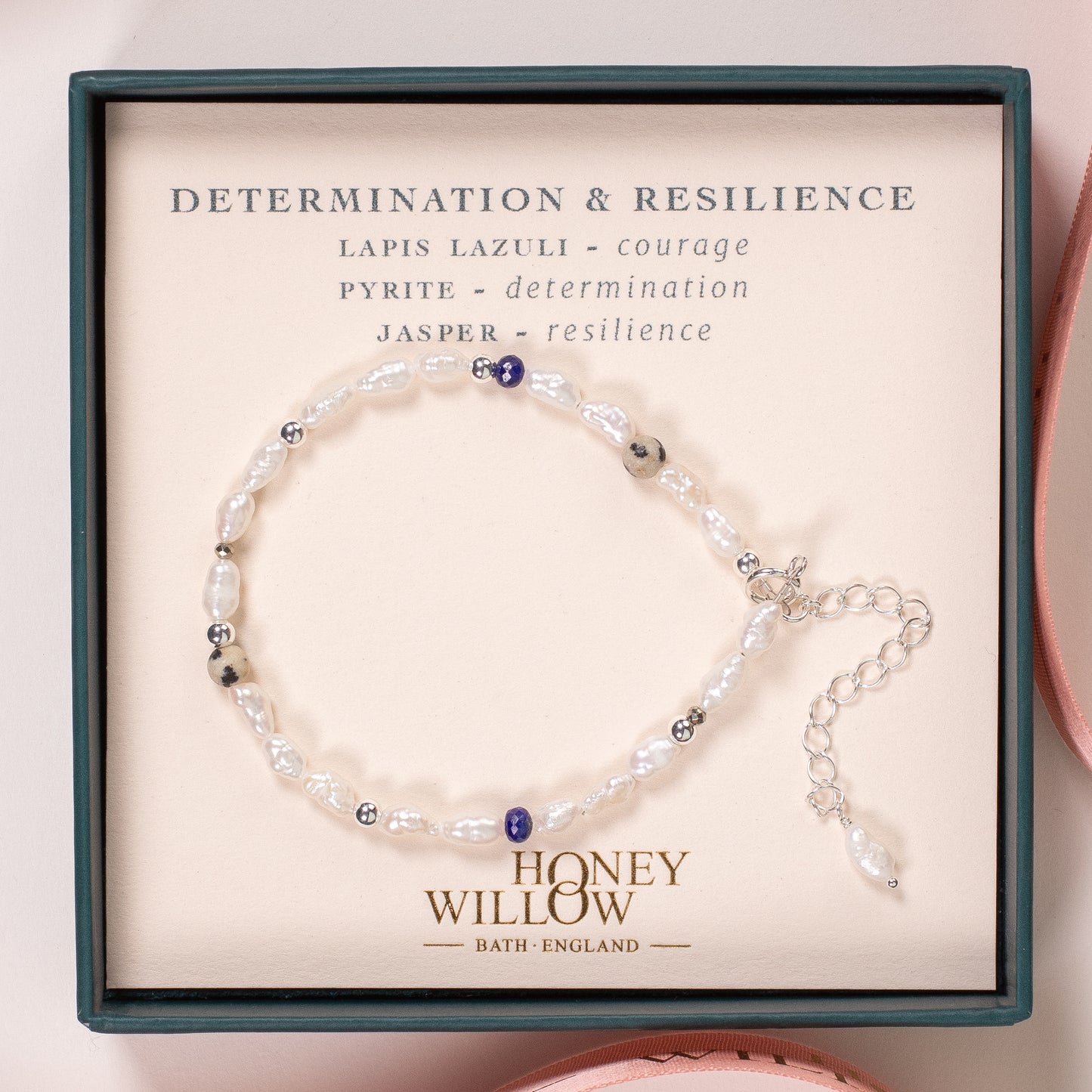 Handmade to order with seed pearls and tiny gemstones: lapis lazuli symbolising courage, pyrite symbolising determination and jasper symbolising resilience.