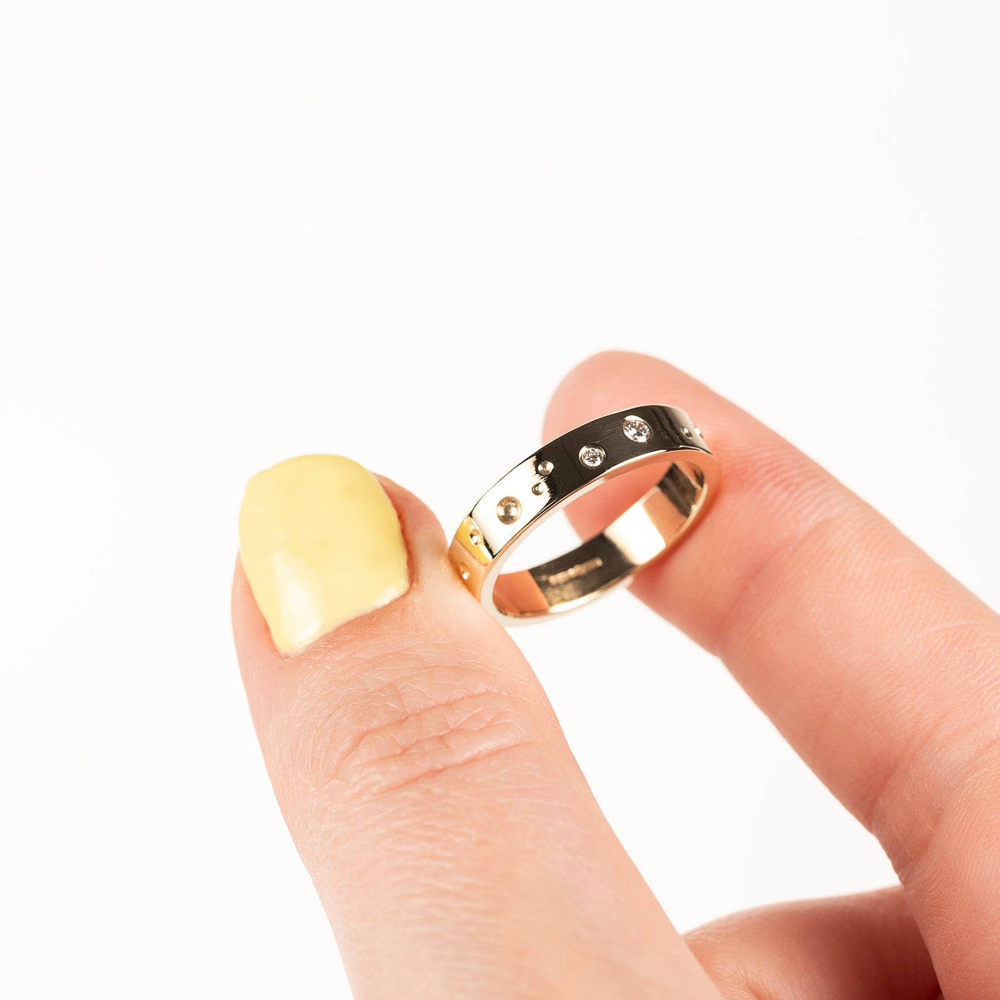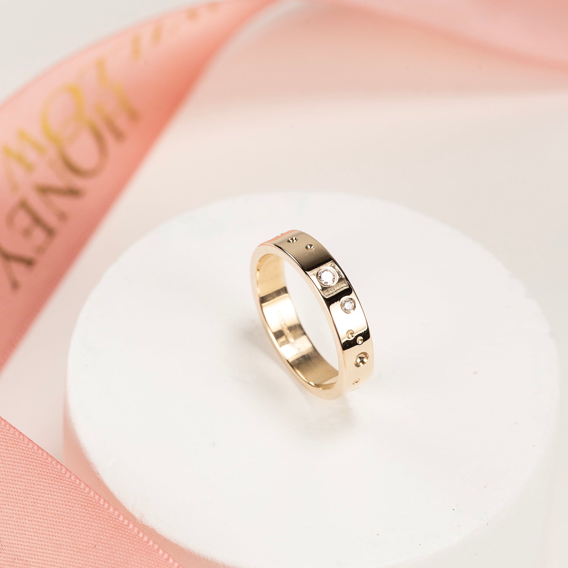 Celebrate her loved ones with a 9kt gold ring symbolising happiness and celebration.  Handmade with lab-grown diamonds for loved ones and a pattern reminiscent of bubbles, which signify joy and living in the moment.