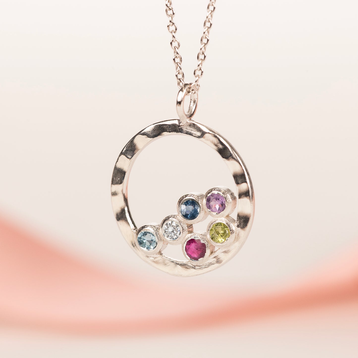 Family Birthstone Halo Necklace - 6 Birthstones for 6 Loved Ones - Silver