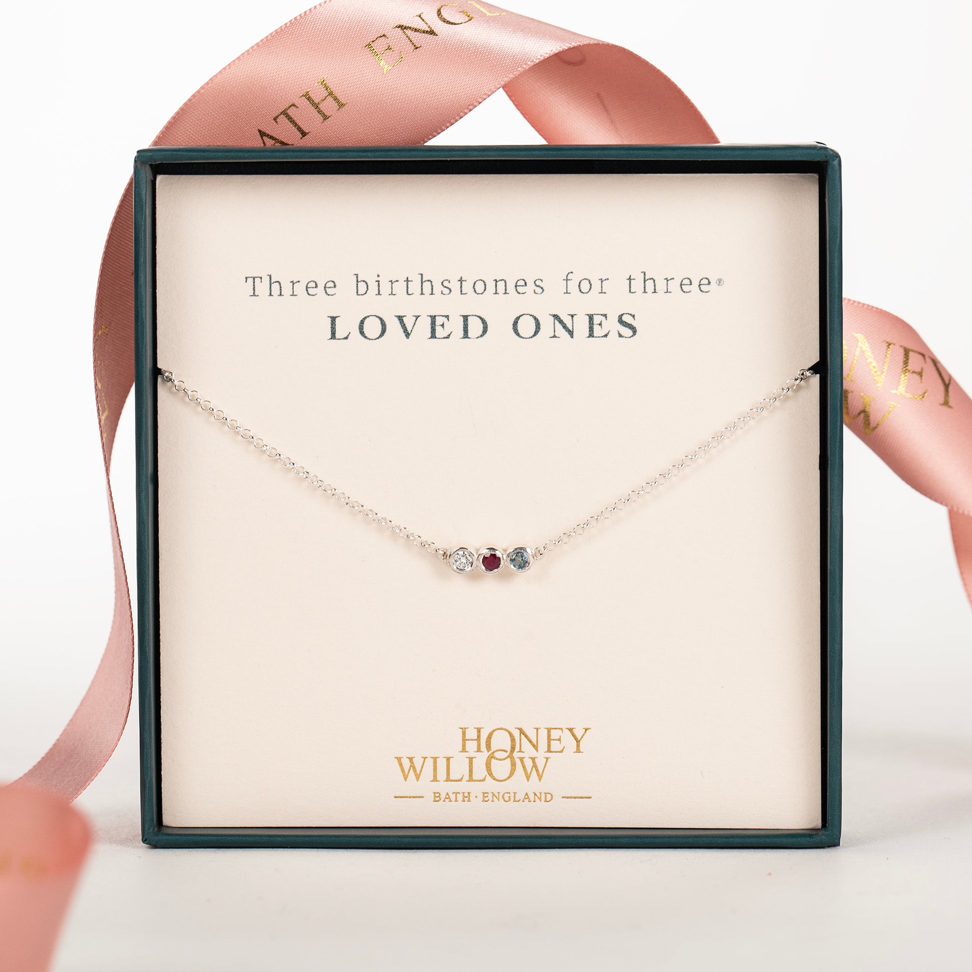 Give her a three birthstones for three® loved ones necklace, designed and handmade in Bath, England. Honey Willow is a family business, founded in 2010.