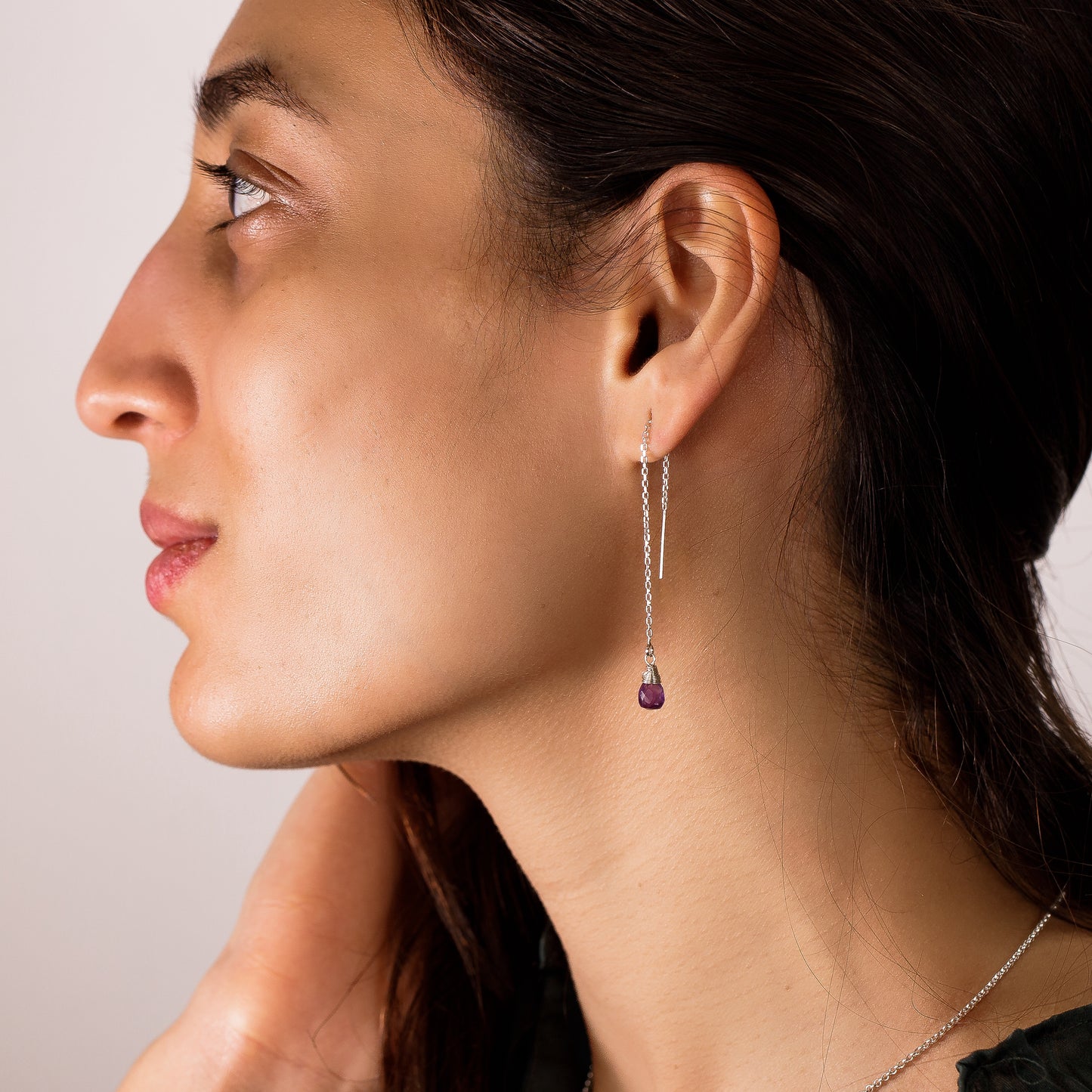 The earrings are made with fine, delicate chain which is threaded through a pierced ear and adjusted so that the birthstone sits where the wearer prefers.
