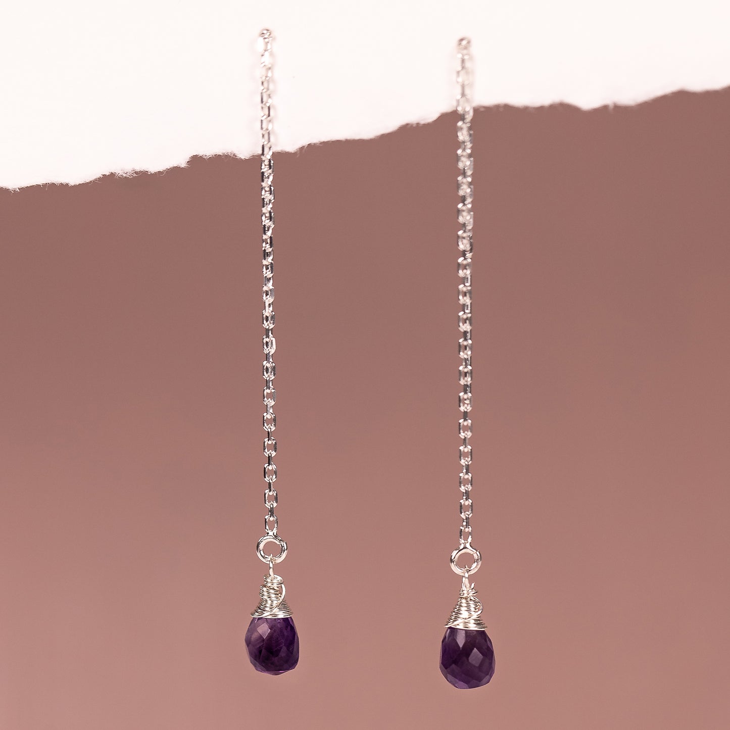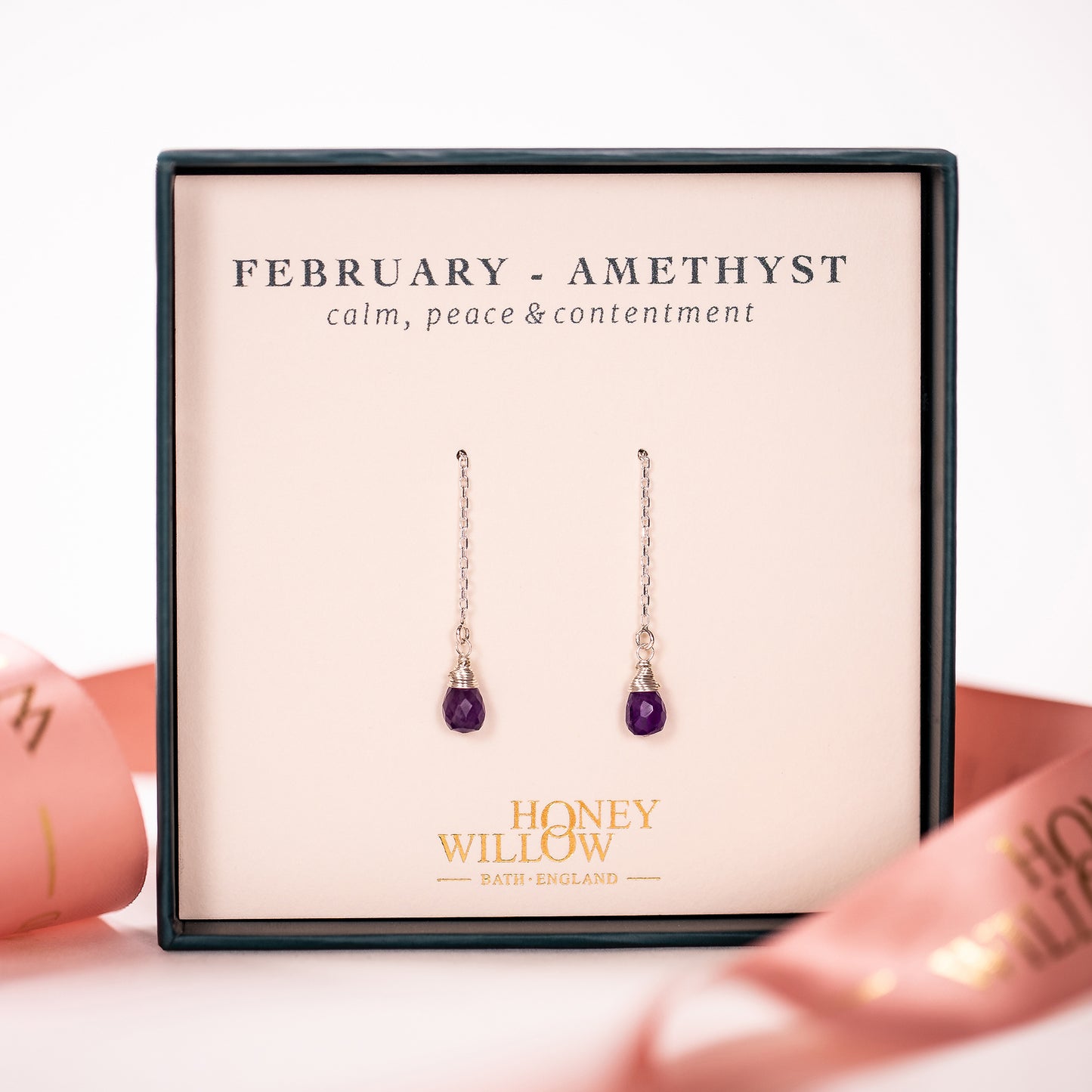 February Birthstone Threader Earrings - Amethyst - Silver & Gold