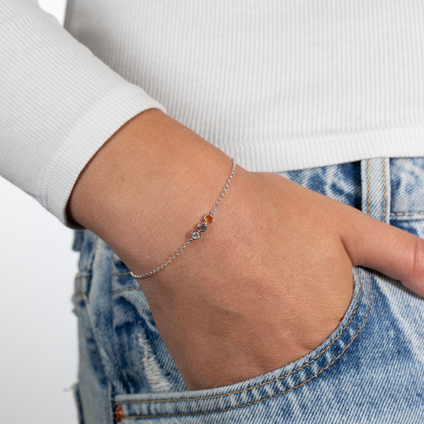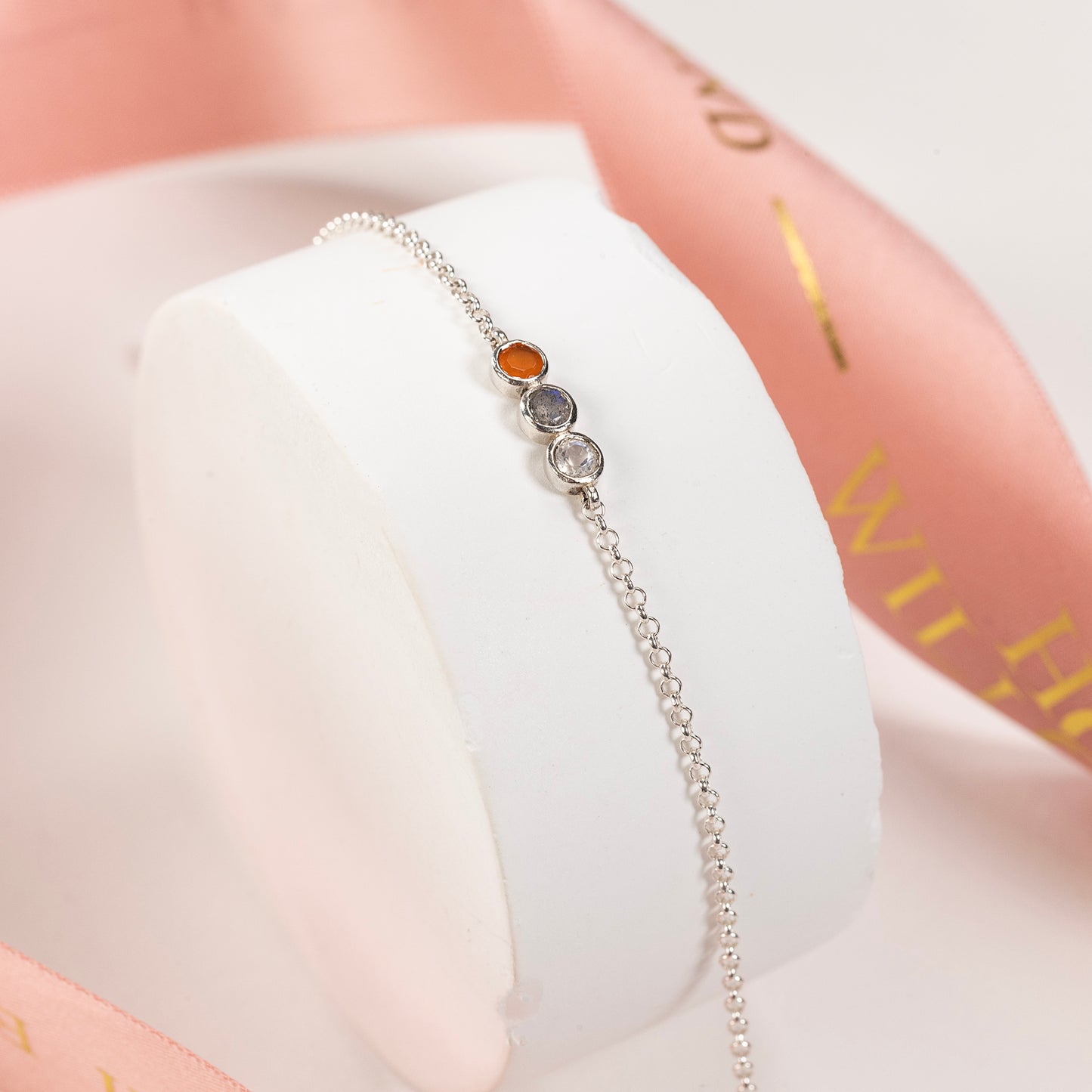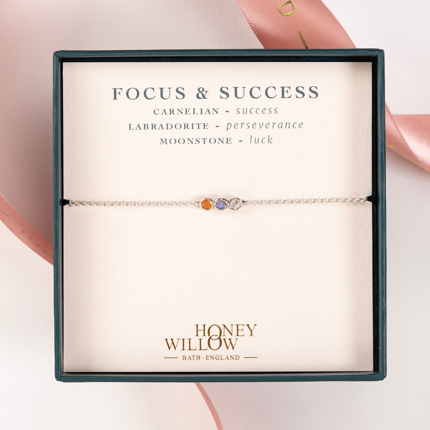 This dainty bracelet is made with three meaningful gemstones. Carnelian symbolises success, labradorite symbolises perseverance and moonstone symbolises luck.