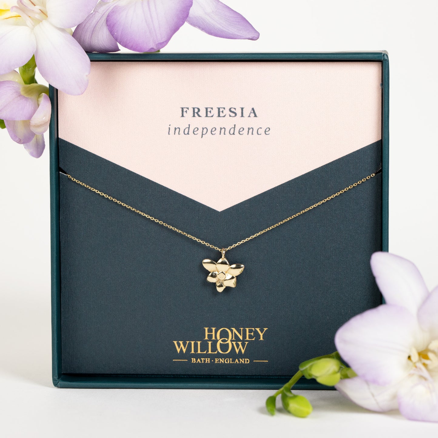 Celebrate and inspire her with a 9kt gold freesia flower necklace.