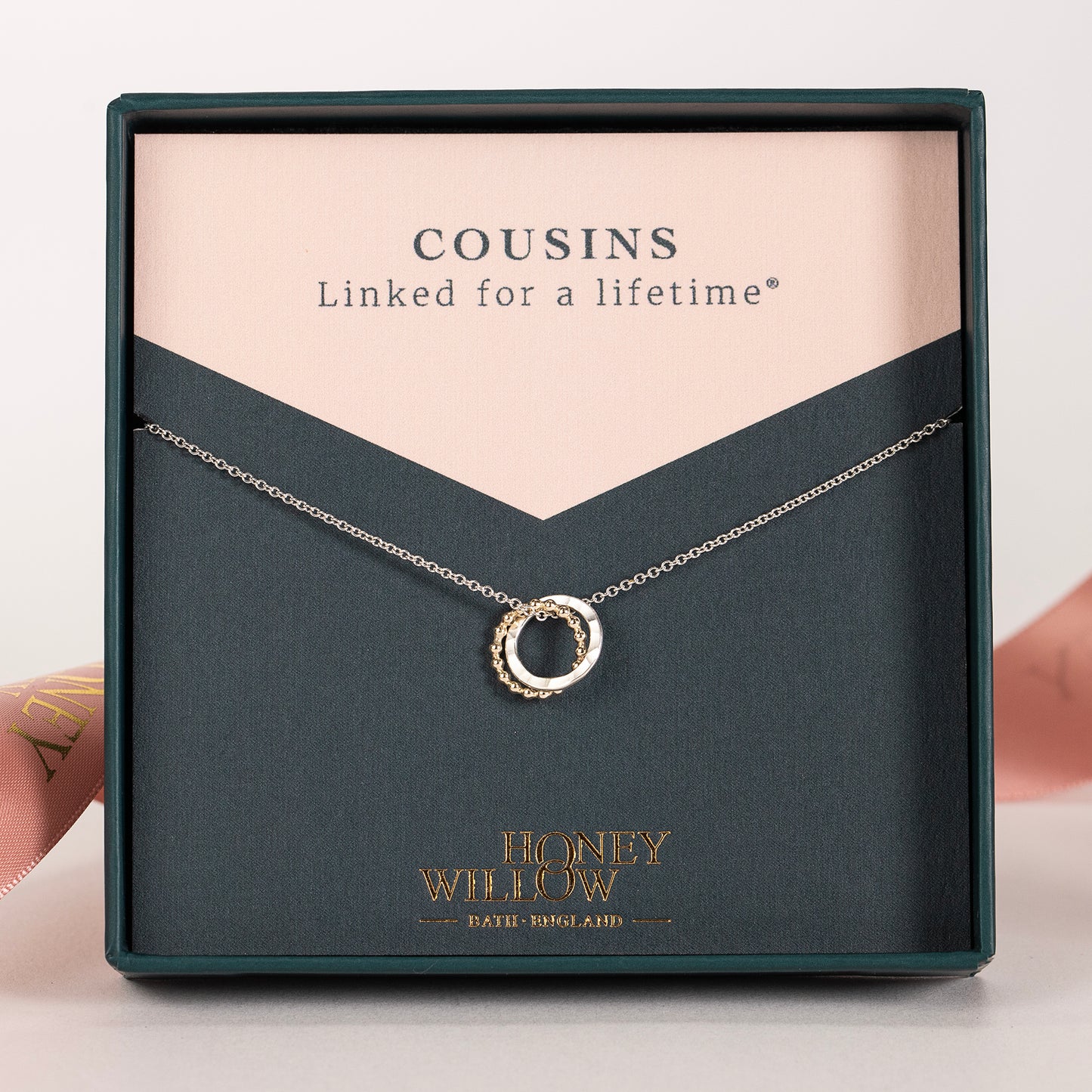 Celebrate the bond between cousins with a dainty 9kt gold and silver love knot necklace.