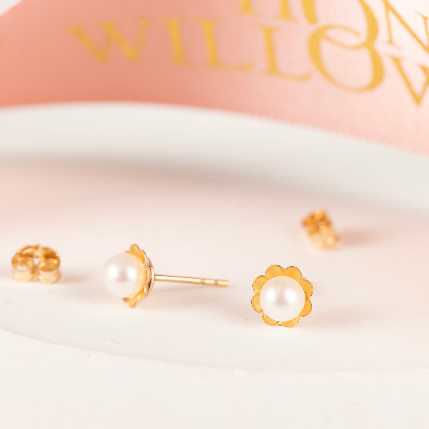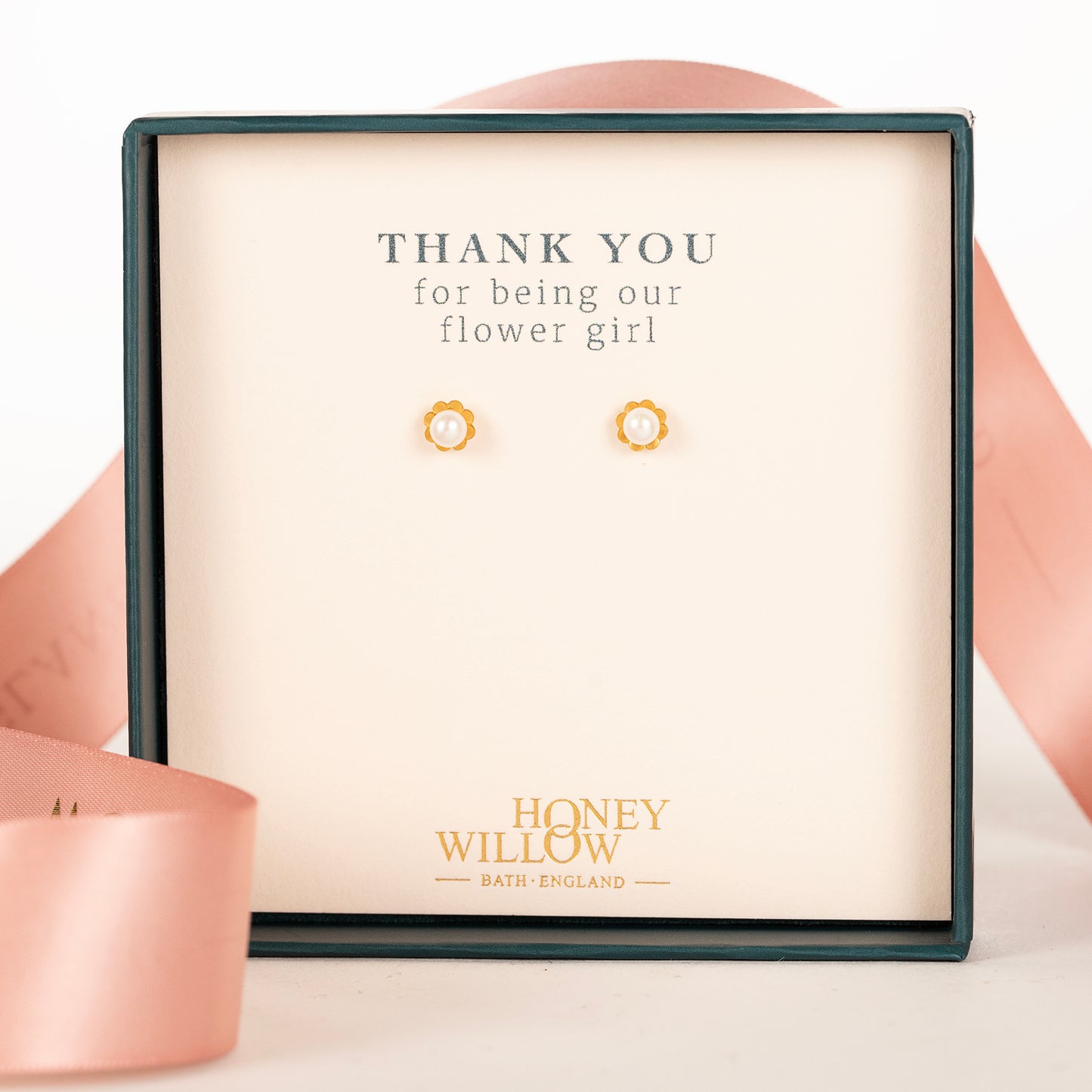 Thank your flower girls with dainty flower and pearl stud earrings.