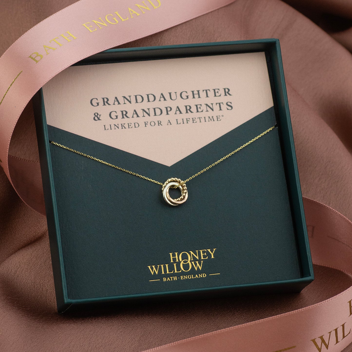 Celebrate the bonds between granddaughter and grandparents, with a dainty 9kt yellow gold, rose gold and silver love knot necklace.