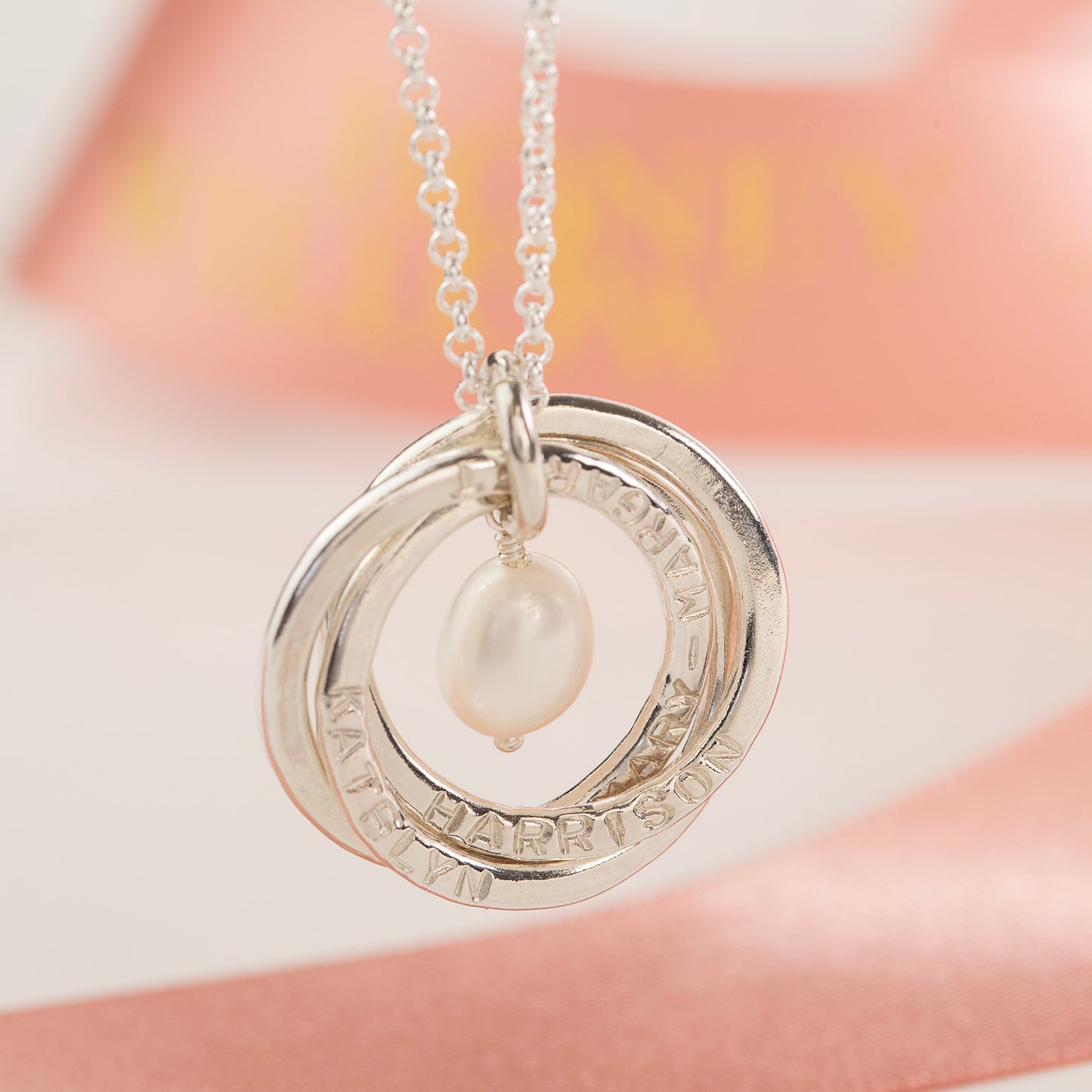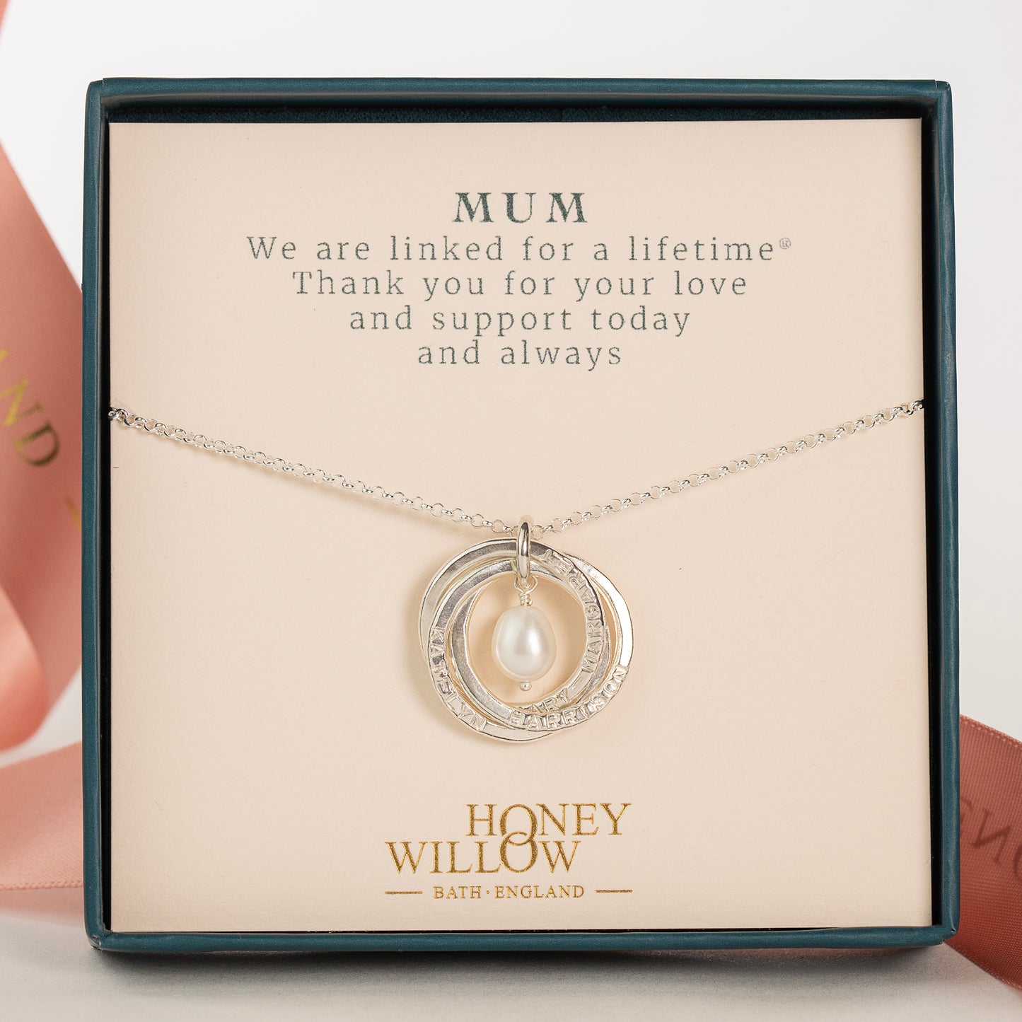 Circles symbolise infinite love, protection and unity. Three circles are linked for a lifetime®. Each link is hand-stamped with the name, word or date which is meaningful to her, up to 20 characters per link.
