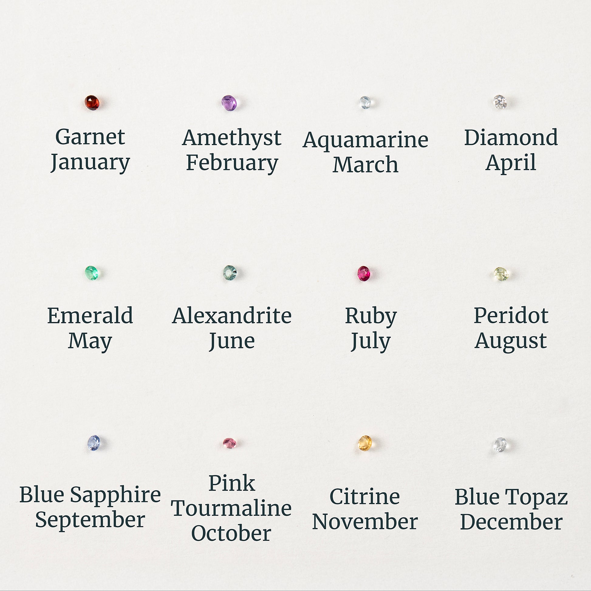 See image 3 for examples of the birthstones. Please note that the diamond is lab-grown. A lab-grown diamond is made from the same material as a mined diamond, without the ethical and environmental problems.