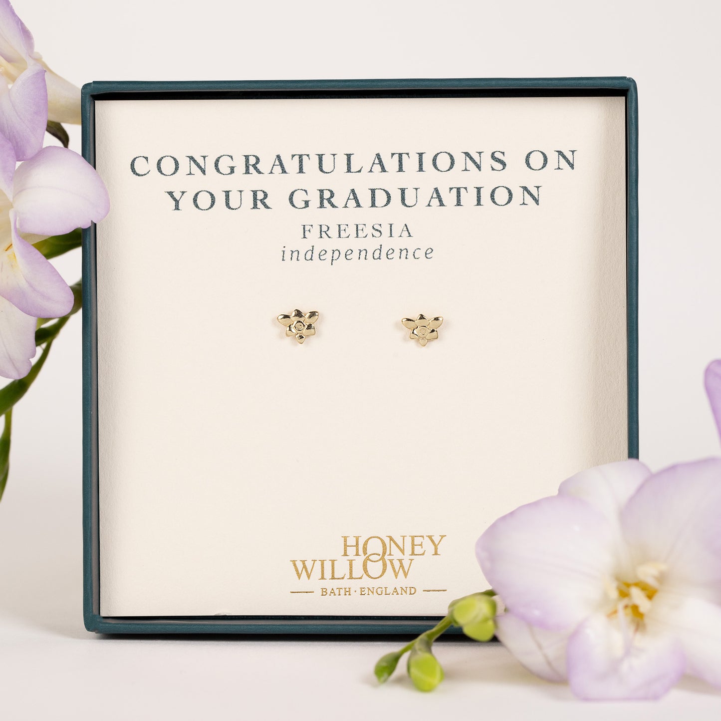 Celebrate her graduation with dainty freesia flower earrings, made with recycled 9kt gold.