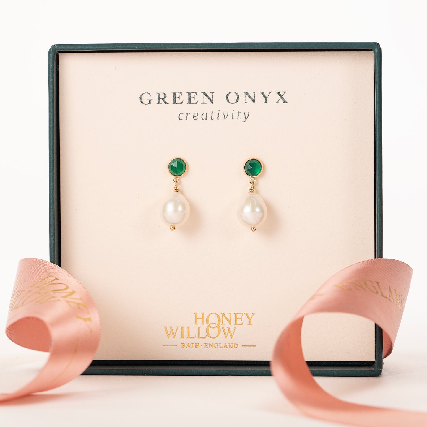 These earrings are handmade with genuine green onyx stones, freshwater pearls and either sterling silver or 14k gold-fill. Gold-fill is 14k gold which is bonded to a base metal. Gold-fill is hard-wearing and good for sensitive ears.
