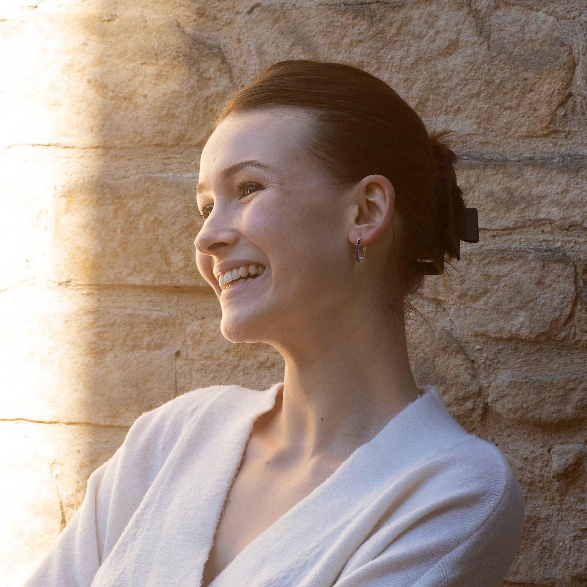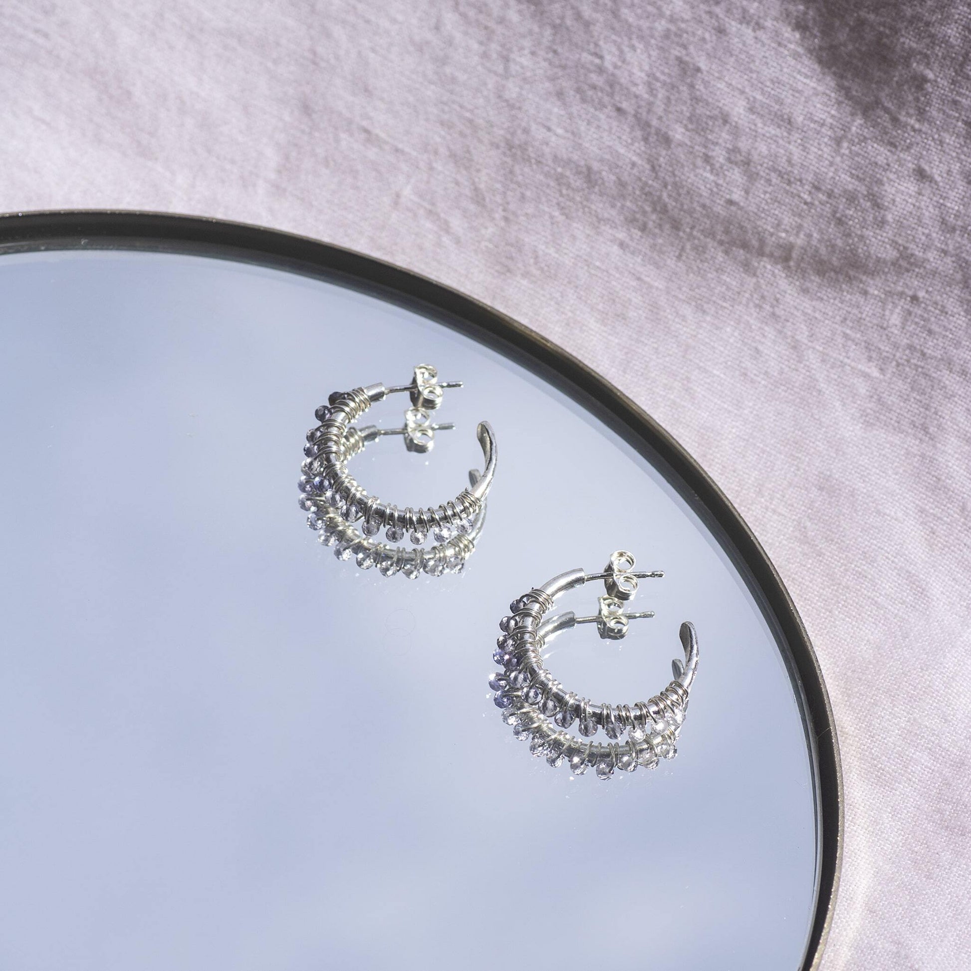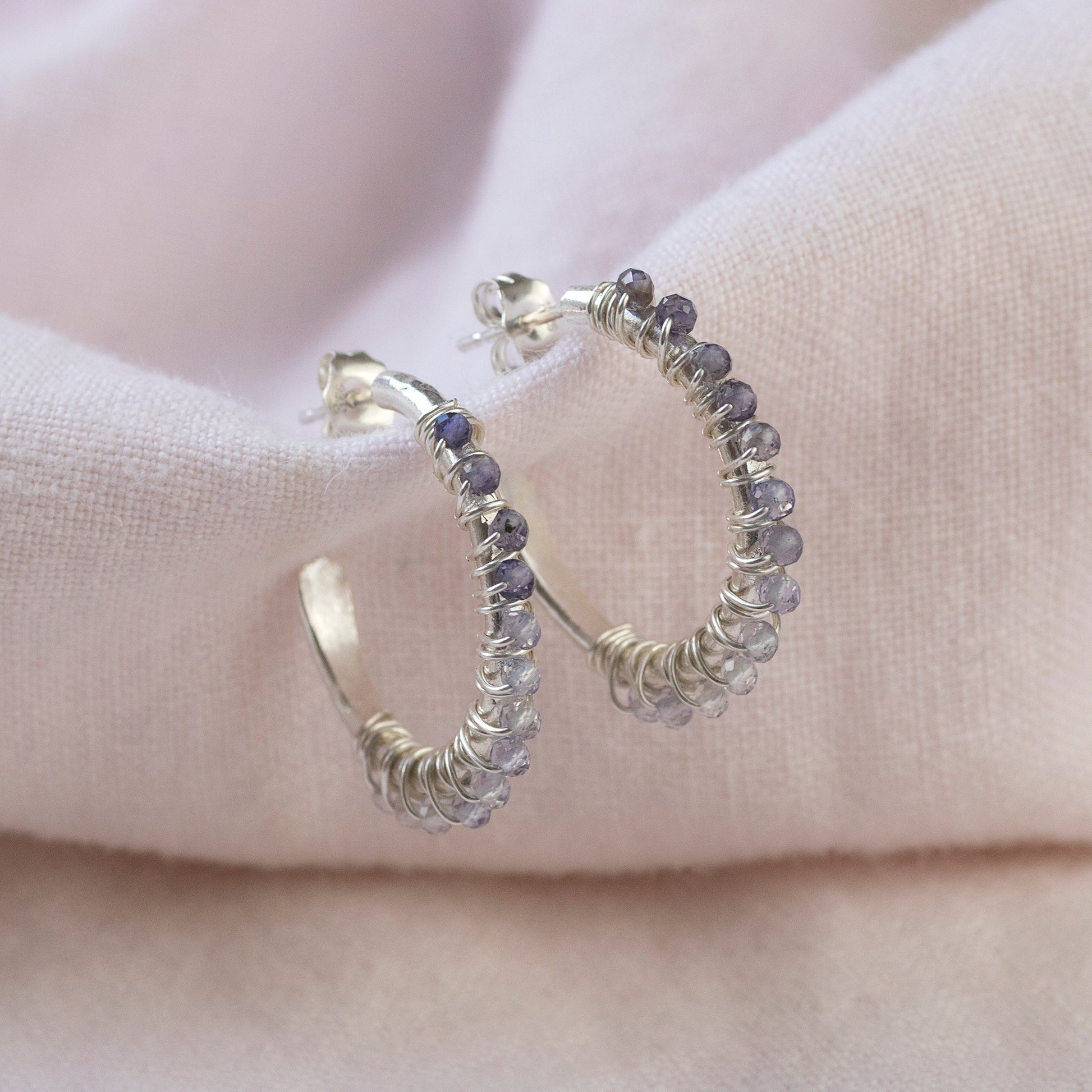 These gemstone hoop earrings are handmade with either sterling silver or 14k gold-fill and tiny iolite stones, which symbolise adventure.