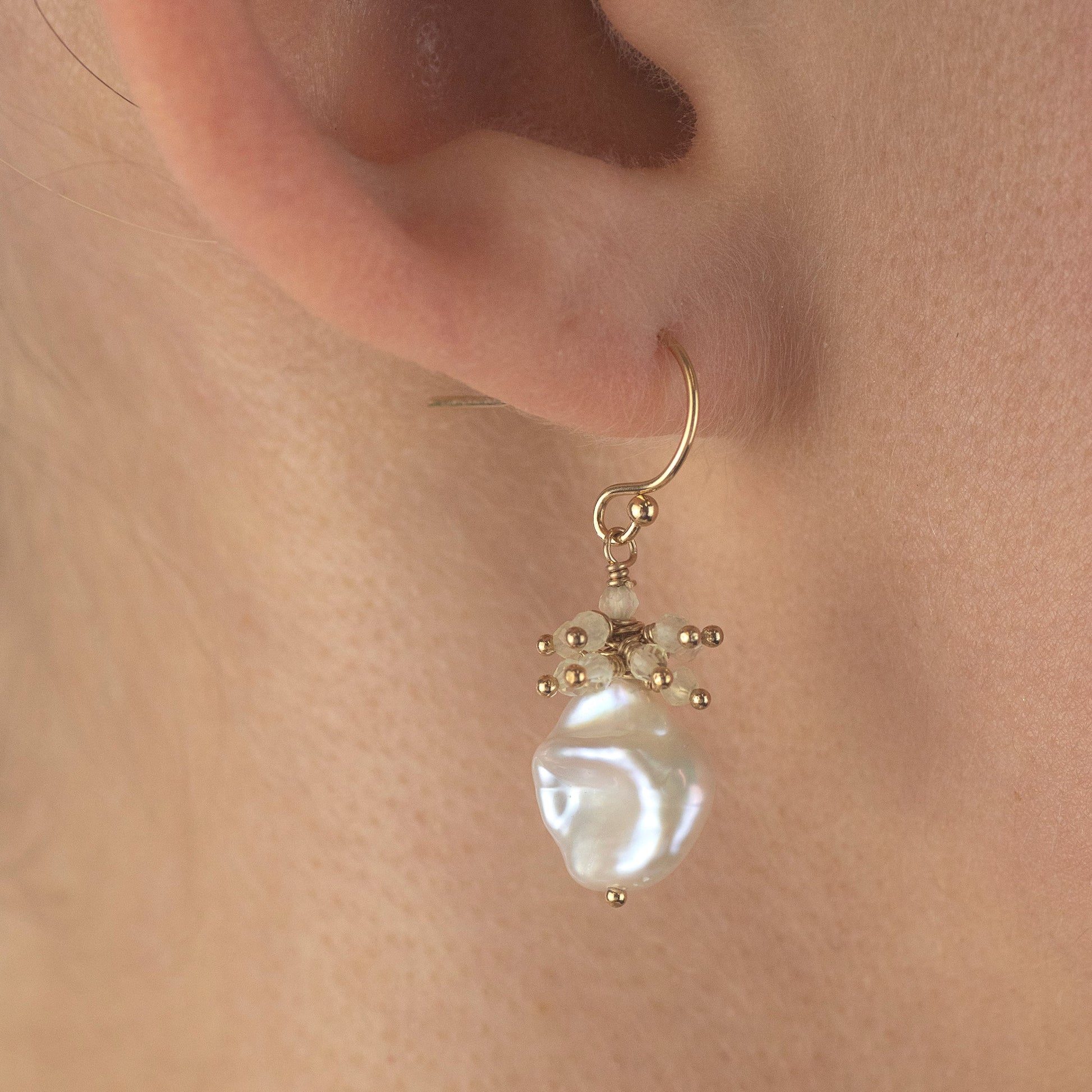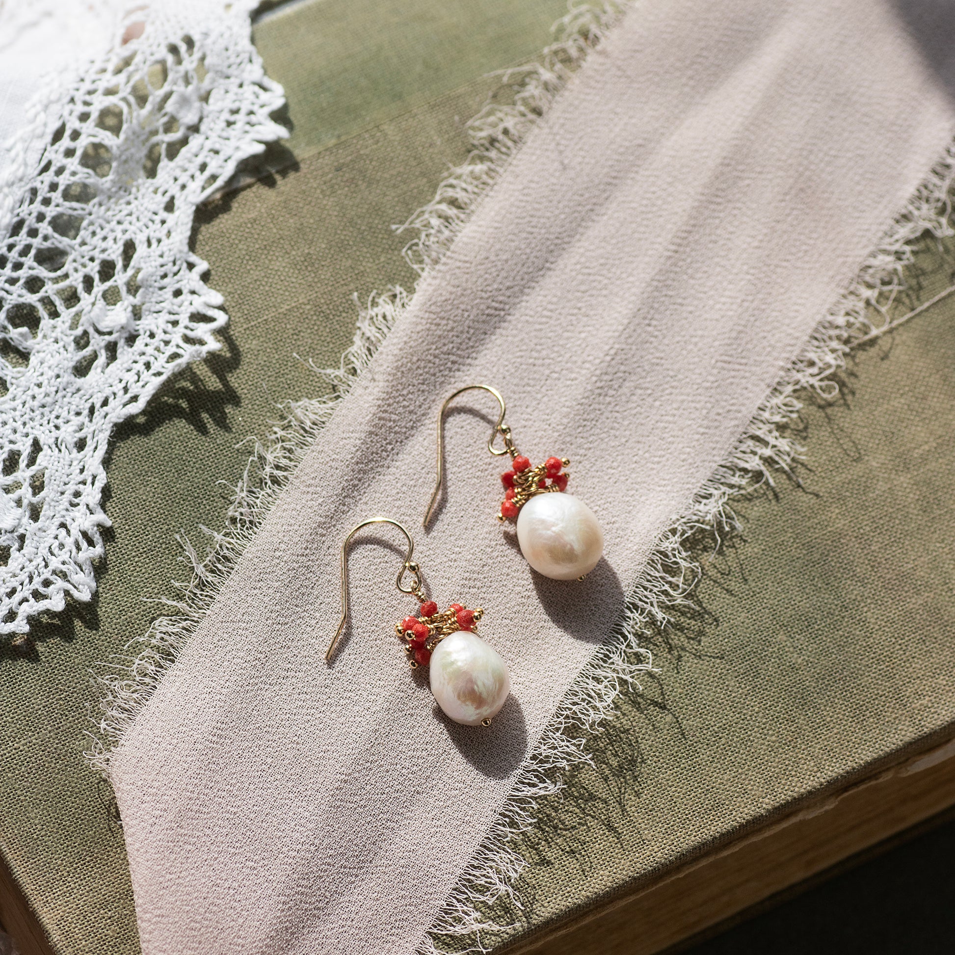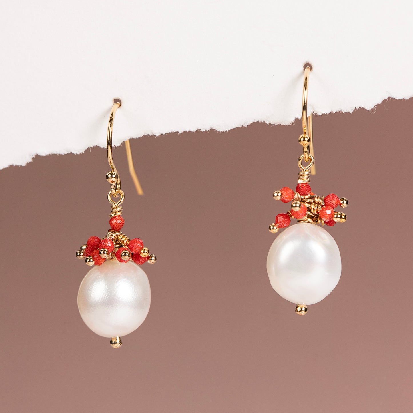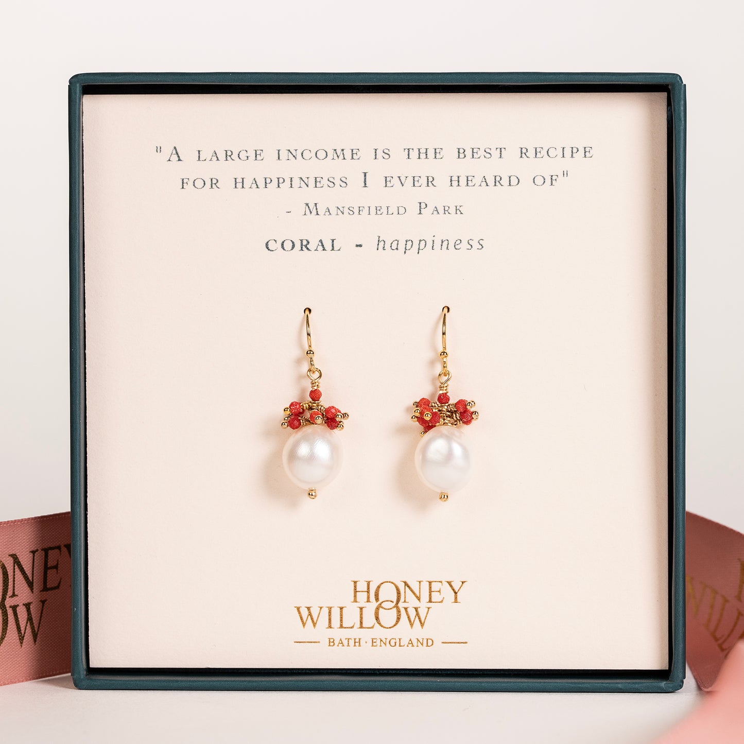 Give her a meaningful gift that celebrates and inspires her. These gemstone earrings are handmade with freshwater keishi pearls and tiny coral stones, which symbolise happiness.