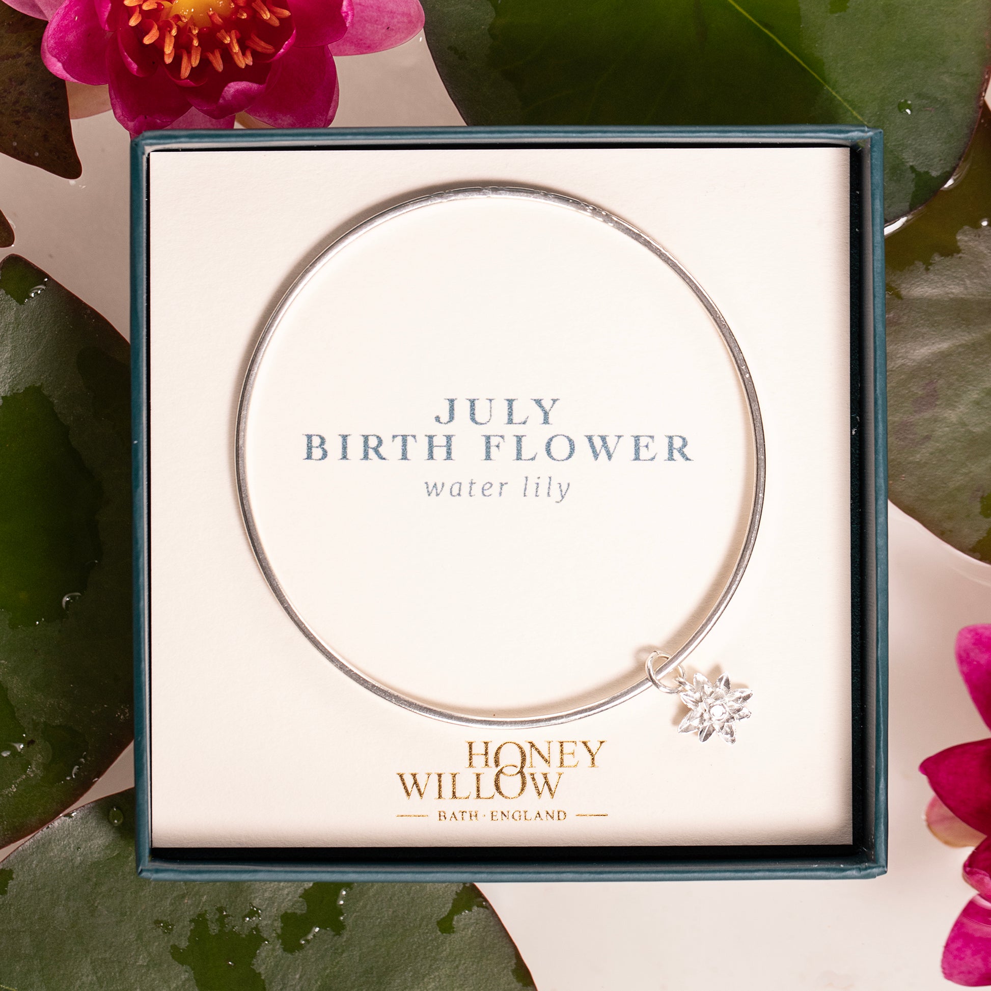 Celebrate her July birthday with a personalised bangle handmade with a waterlily charm.