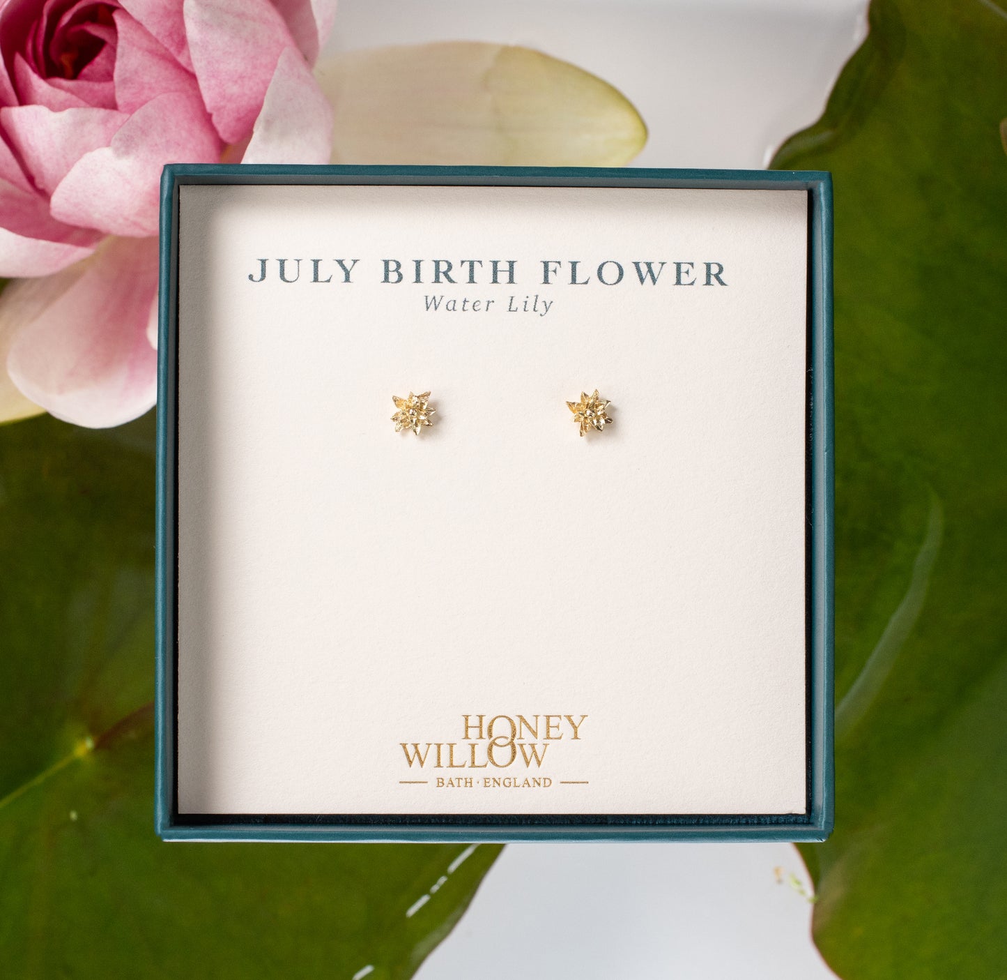 July Birth Flower Stud Earrings - Waterlily - 9kt Gold