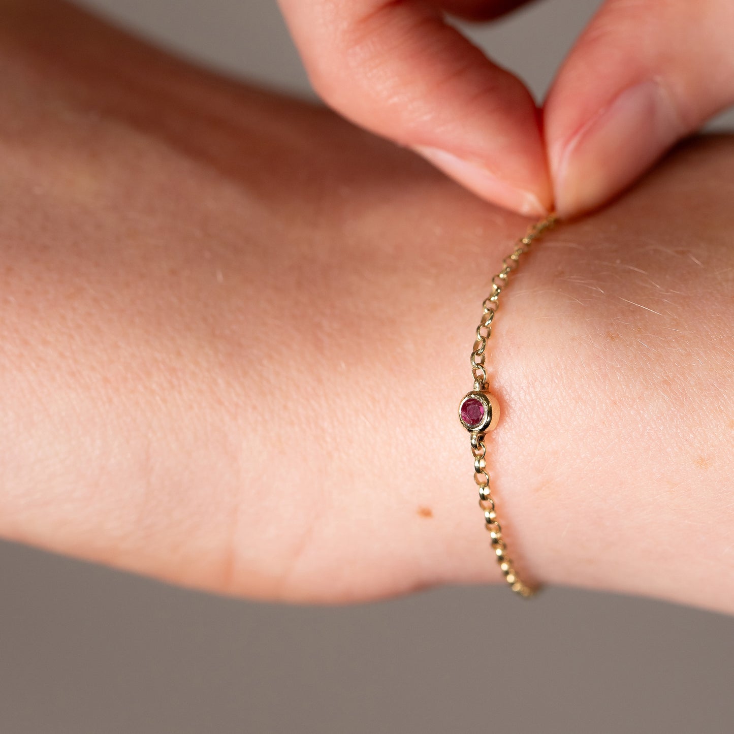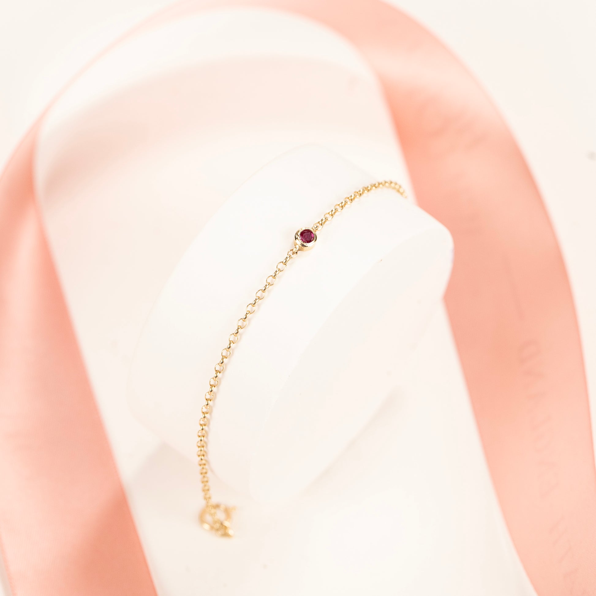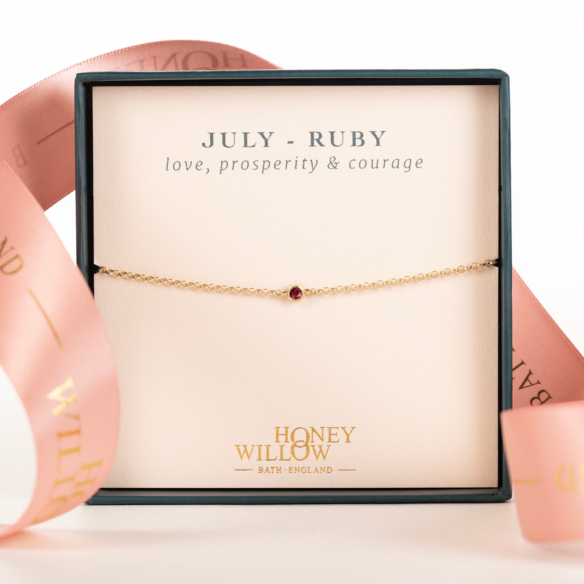 Celebrate her July birthday with a dainty 9kt gold bracelet, handmade with a genuine ruby.
