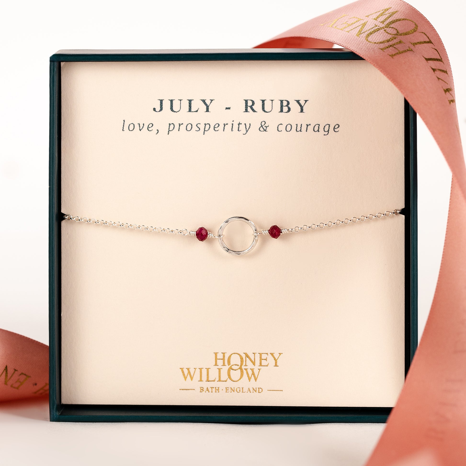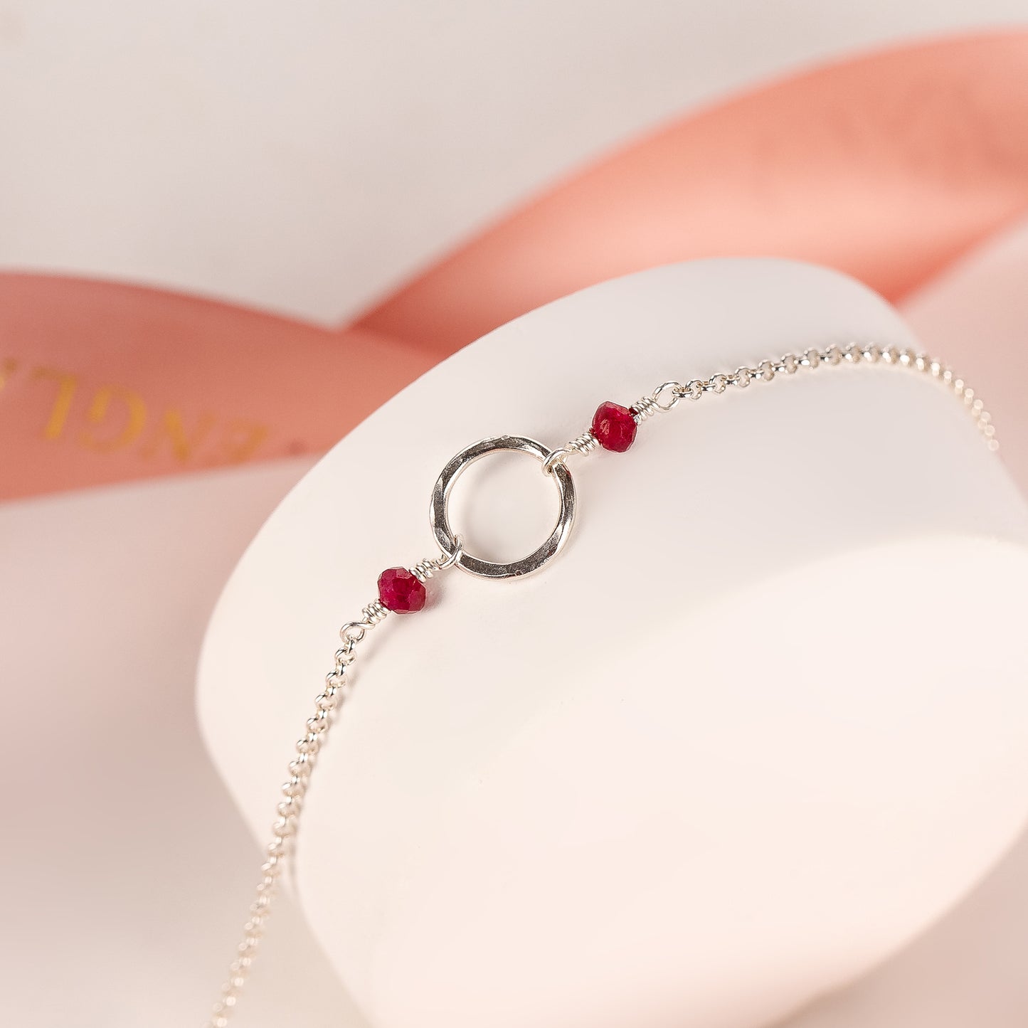 Celebrate her July birthday with a delicate bracelet handmade with her birthstones on either side of a circle.