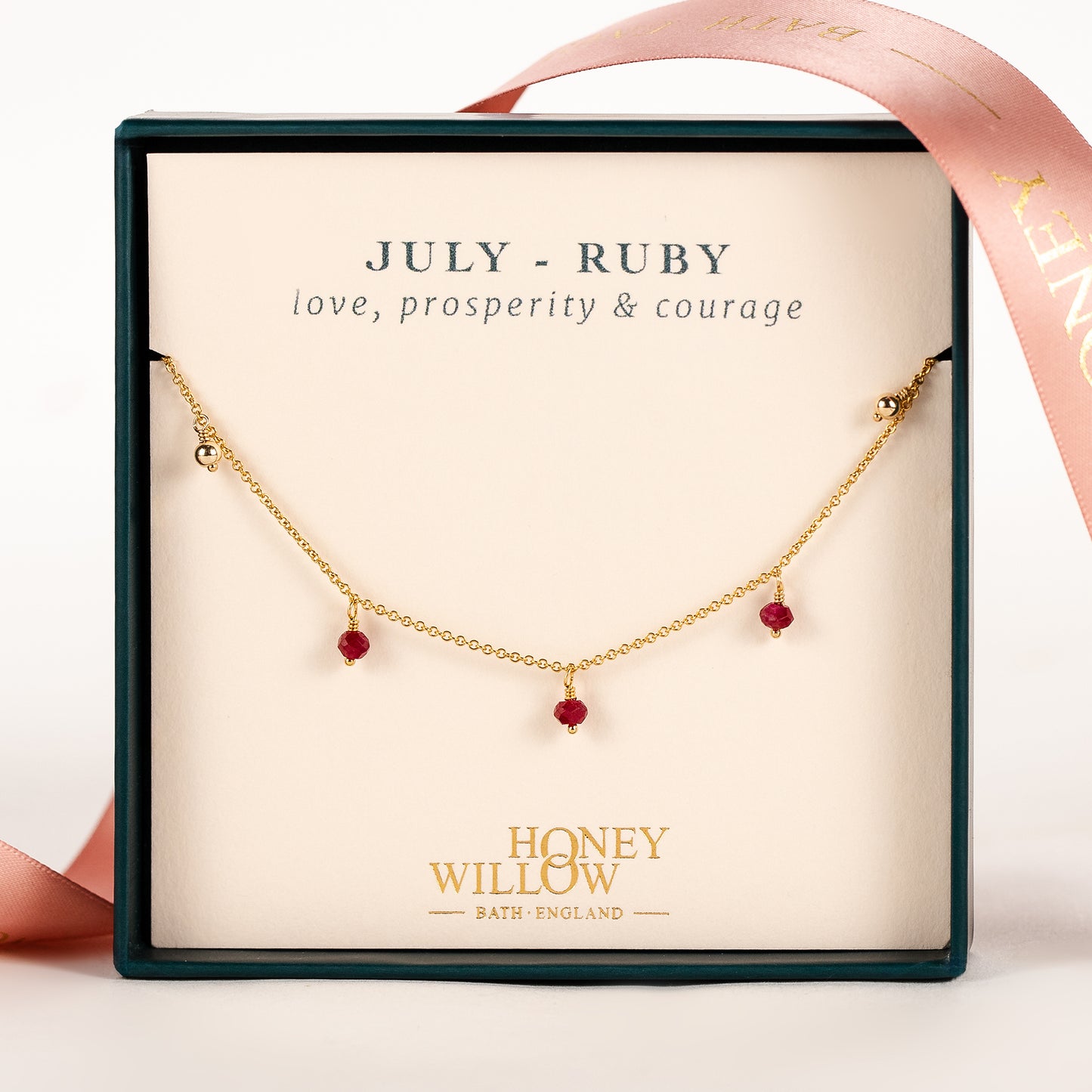 Celebrate your loved one's July birthday with a delicate necklace, handmade with a trio of her birthstones.