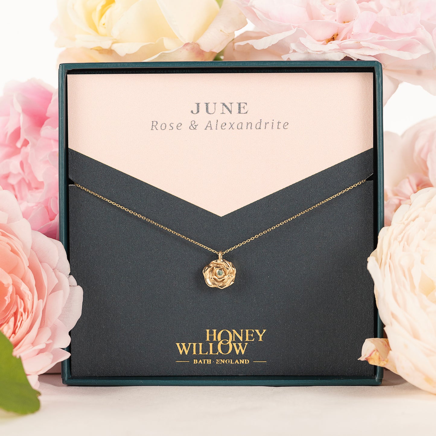 June Birth Flower & Birthstone Necklace - Rose & Alexandrite - 9kt Gold