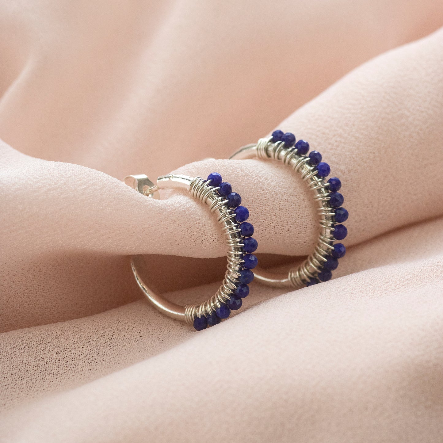 These gemstone hoop earrings are handmade in either sterling silver or 14k gold-fill, with tiny lapis lazuli stones.