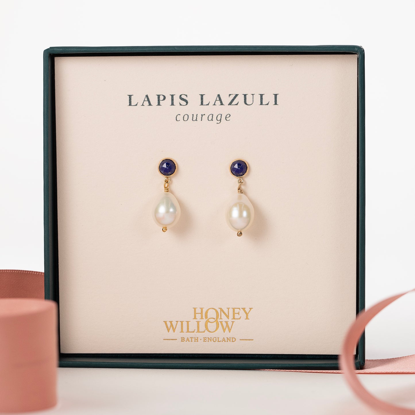 Lapis Lazuli & Pearl Earrings - Courage - Silver & Gold