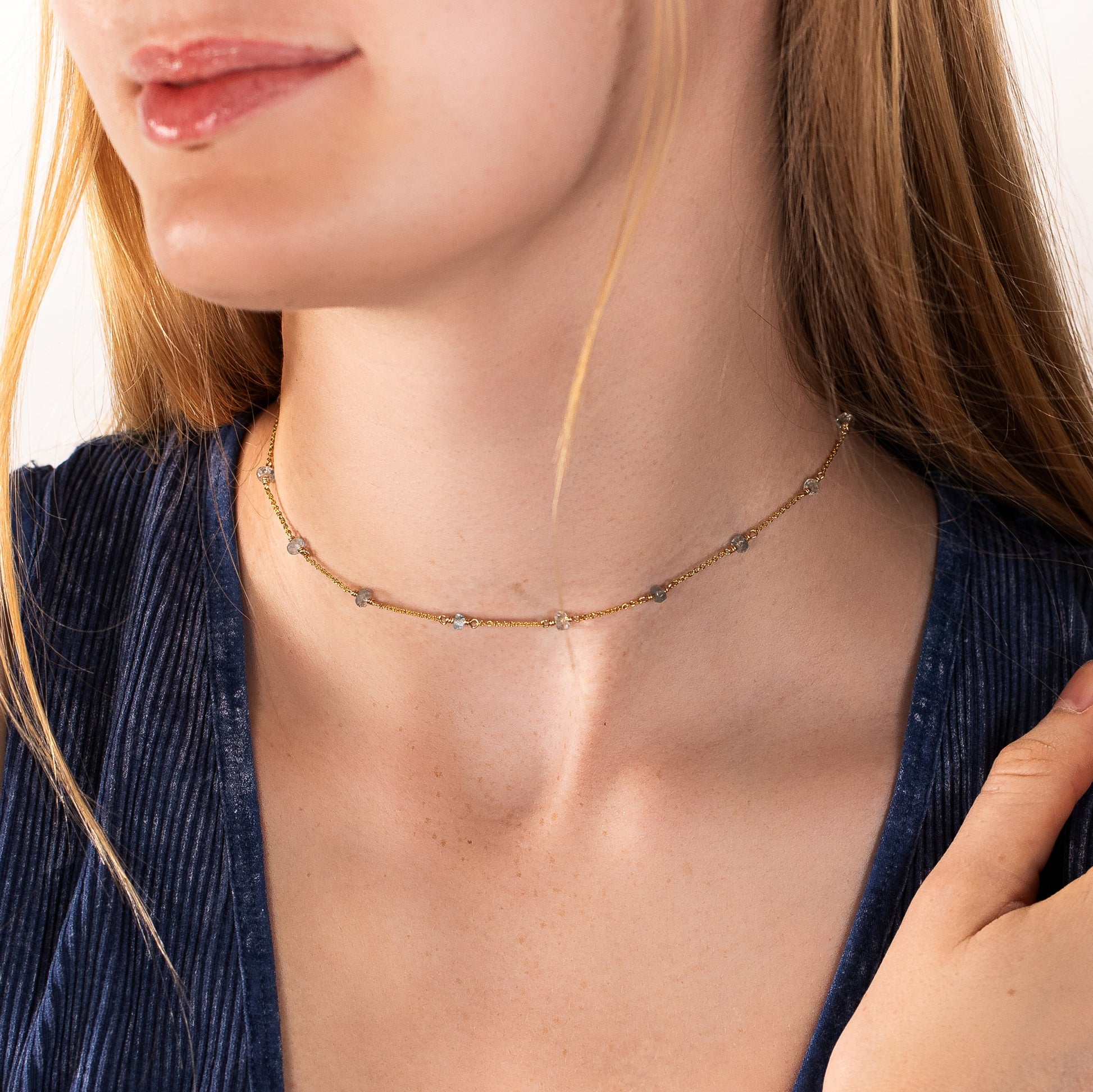 Celebrate her March birthday with a delicate satellite necklace handmade with tiny birthstones hand-wired into the chain. The necklace is worn short, like a choker and is perfect for layering.