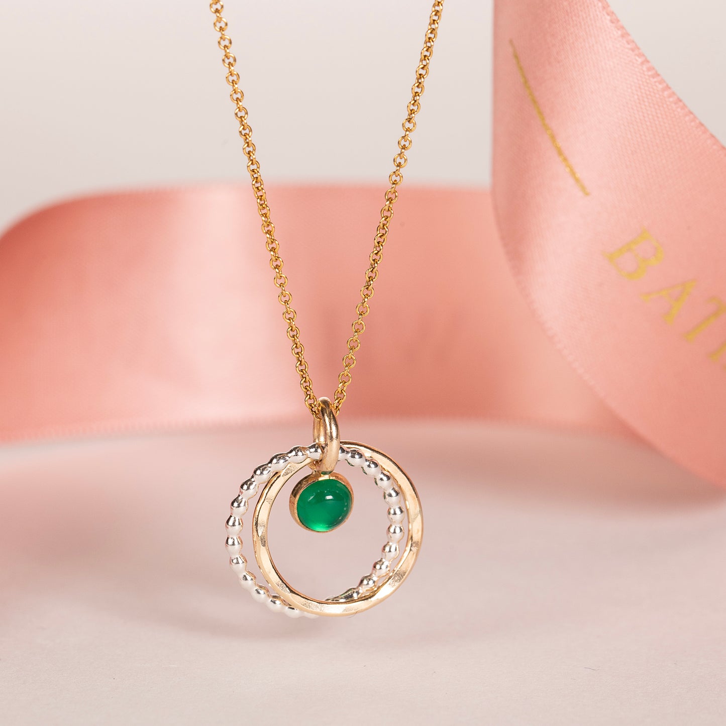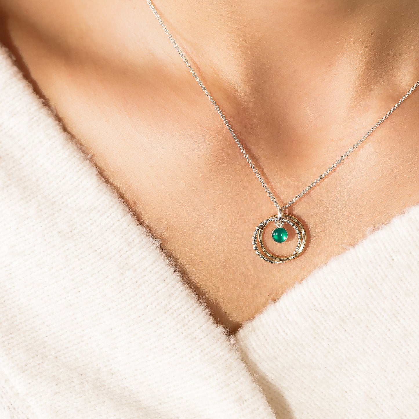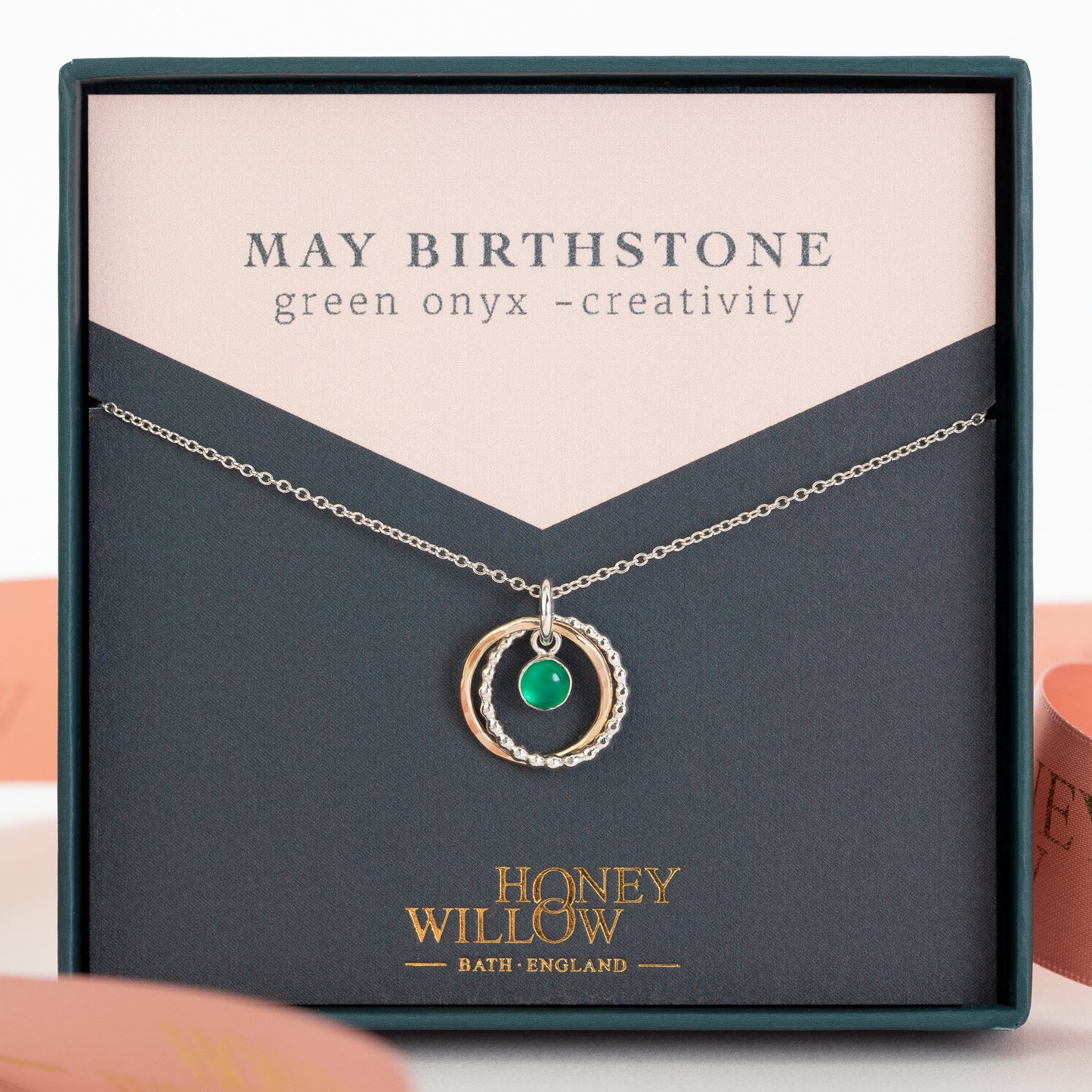 Circles symbolise infinite love, strength and protection. Two circles encircle a green onyx stone, which is one of the birthstones for May.