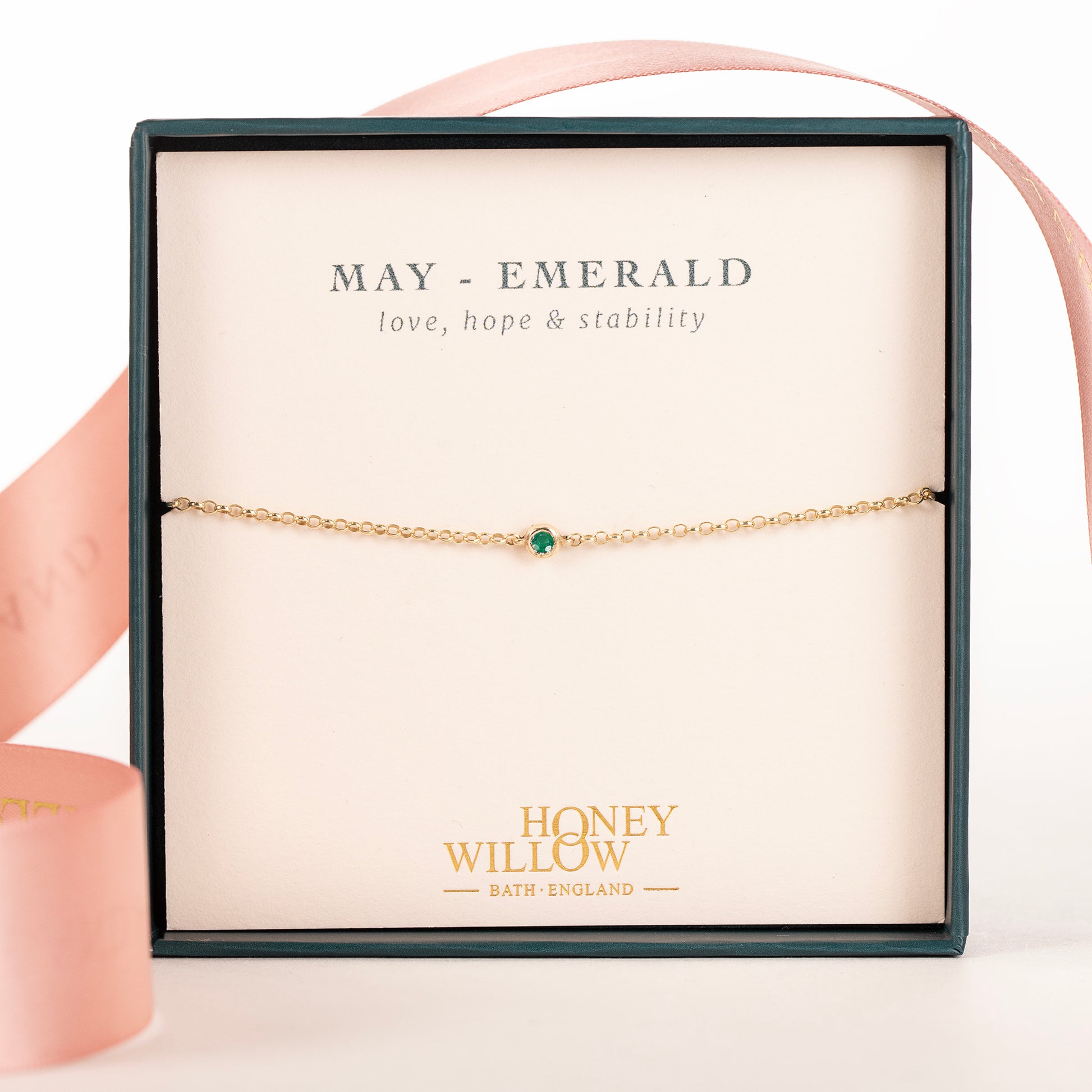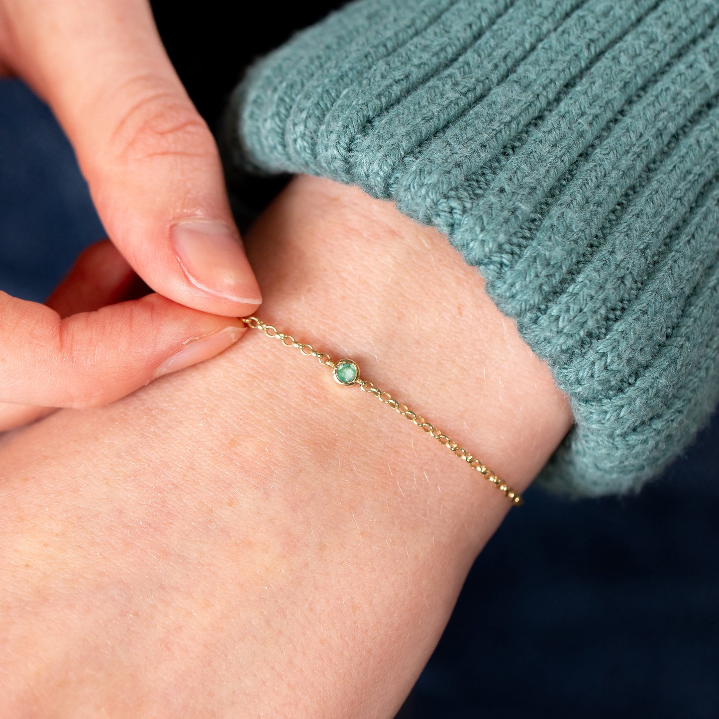 Celebrate her May birthday with a dainty 9kt gold bracelet, handmade with a genuine emerald.