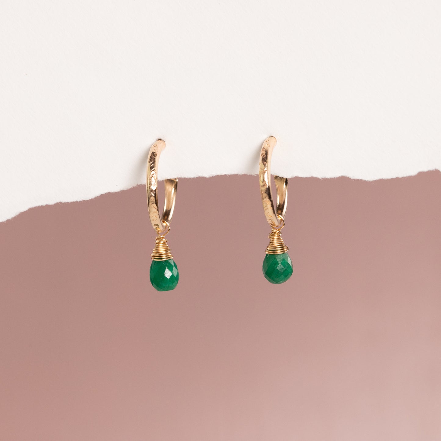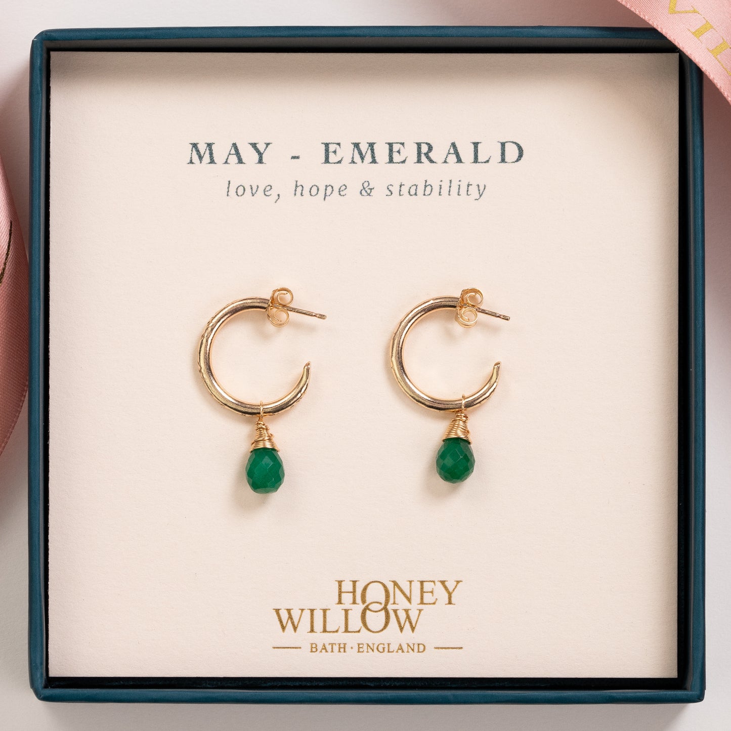 May Birthstone Earrings - Emerald Gold Hoops - 1.5cm