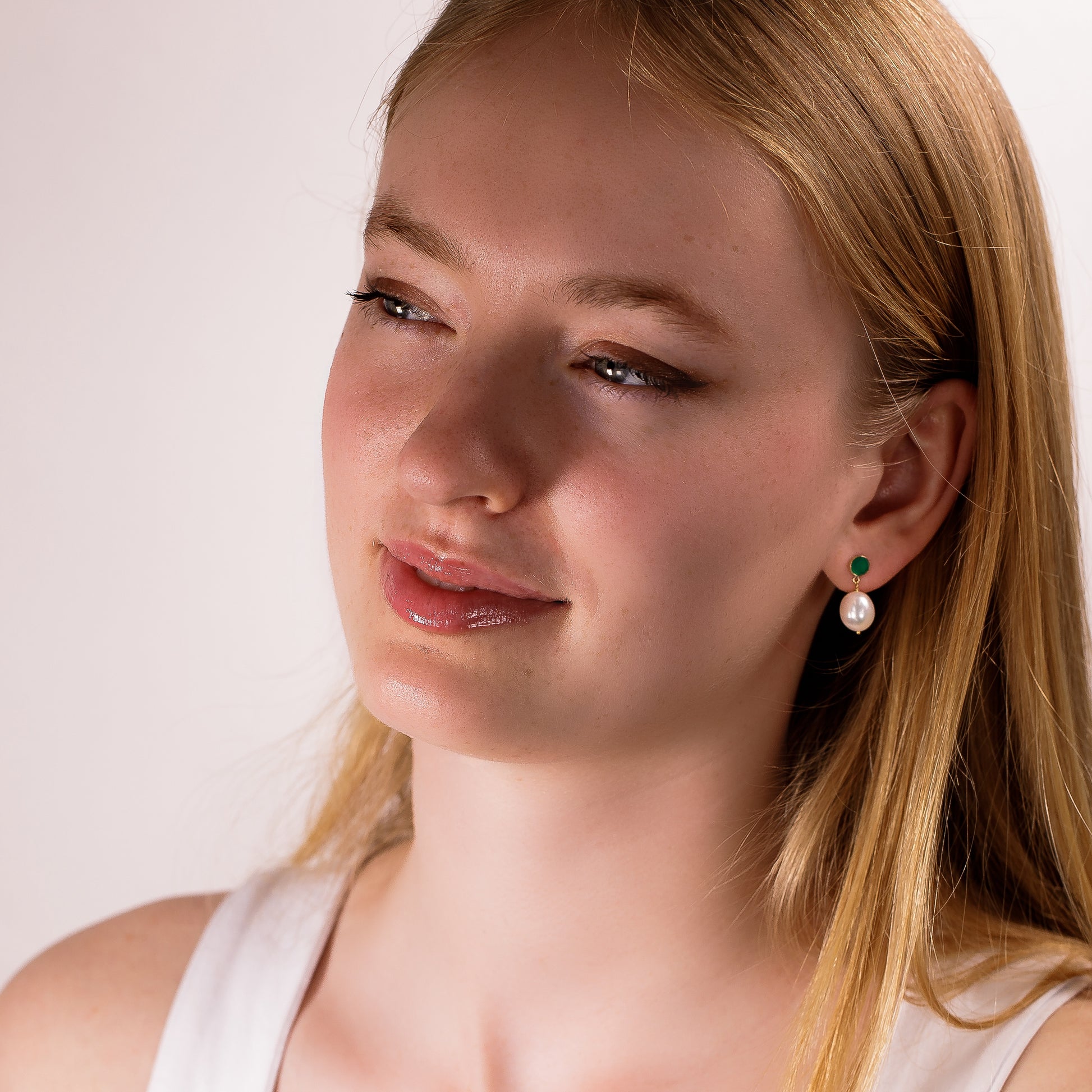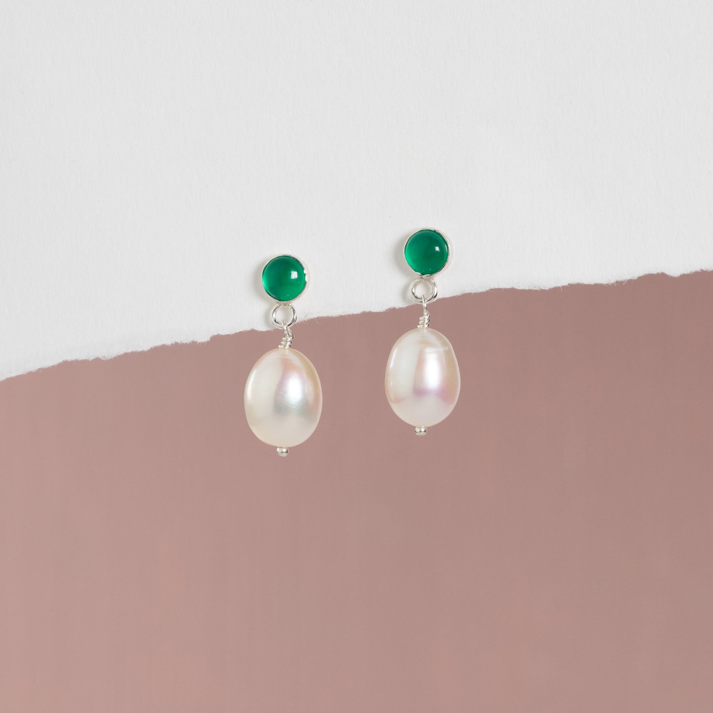 These earrings are handmade with green onyx stones, freshwater pearls and either sterling silver or 14k gold-fill.