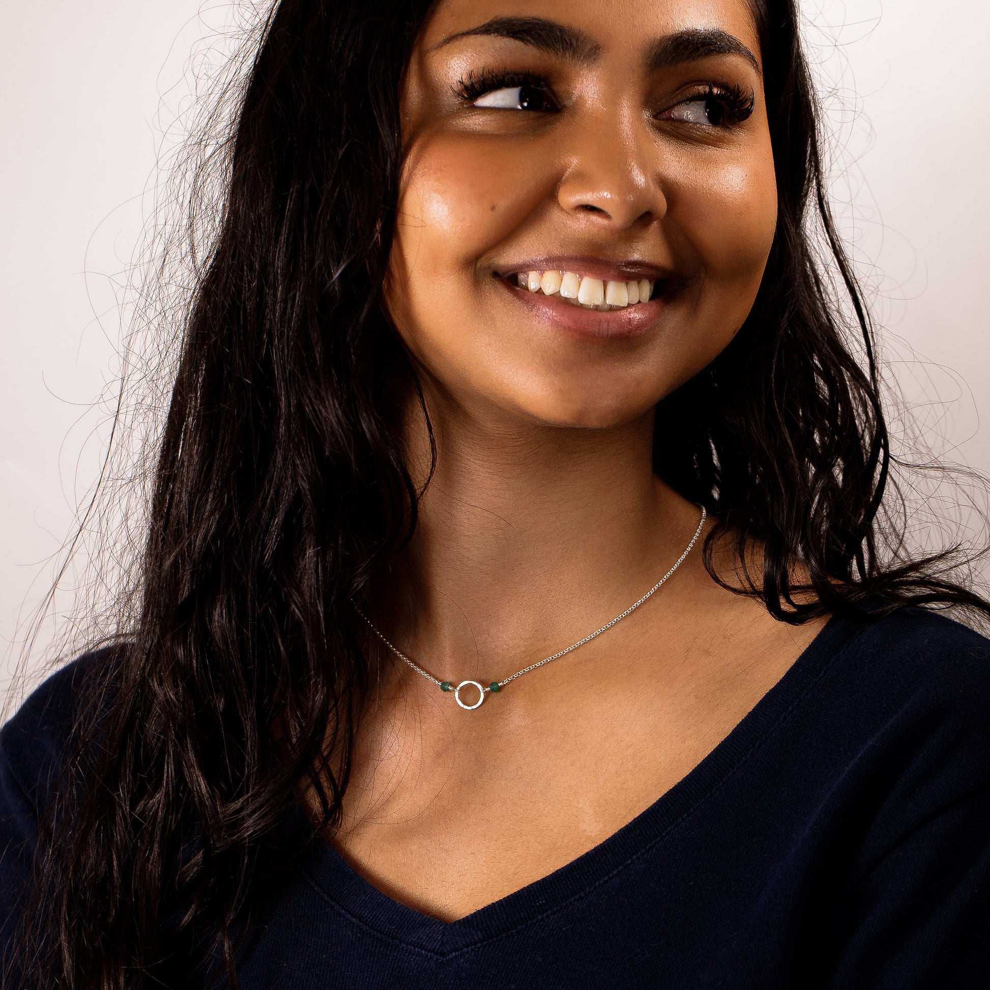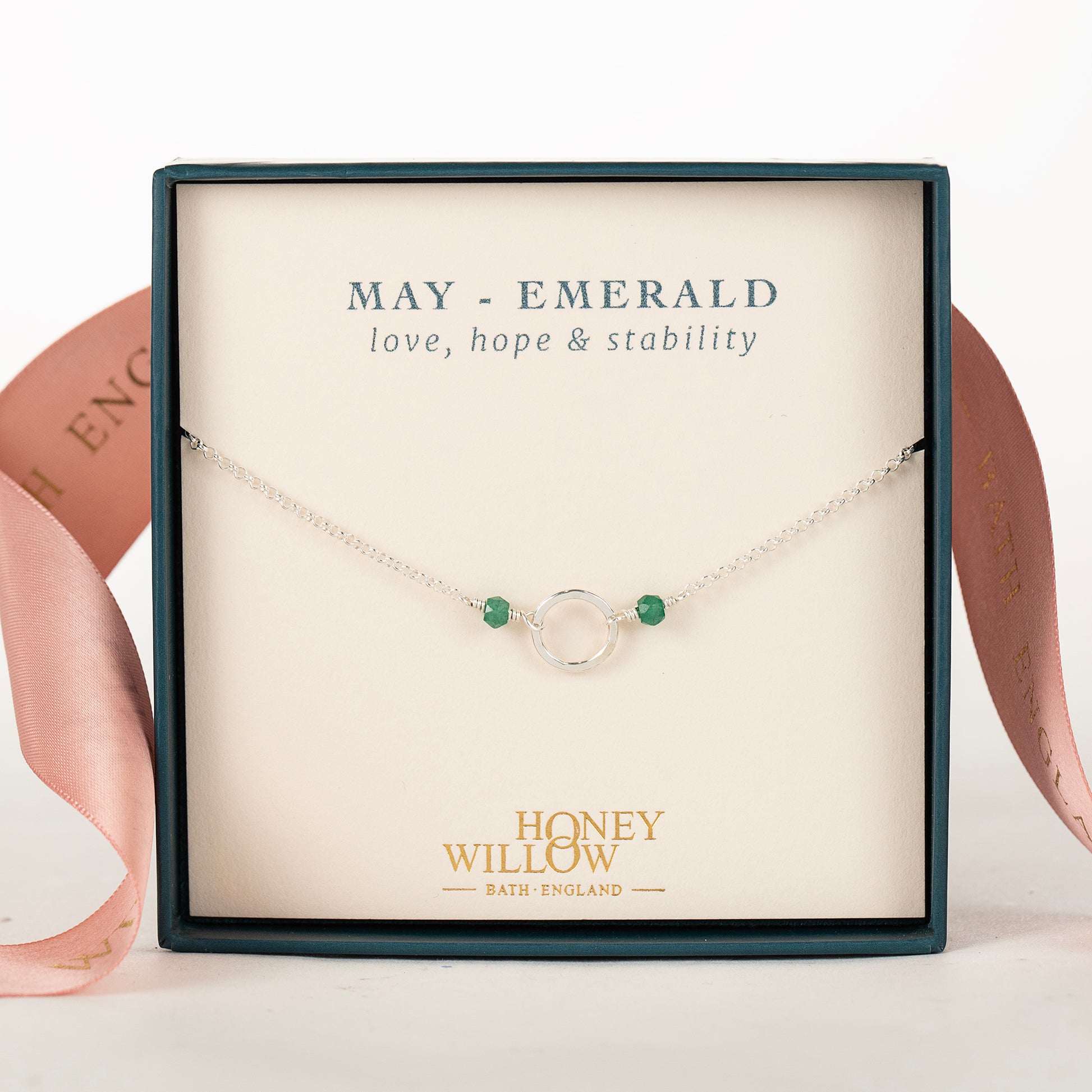 Circles symbolise infinite love, strength and protection. May's birthstone emerald is on either side of the circle.