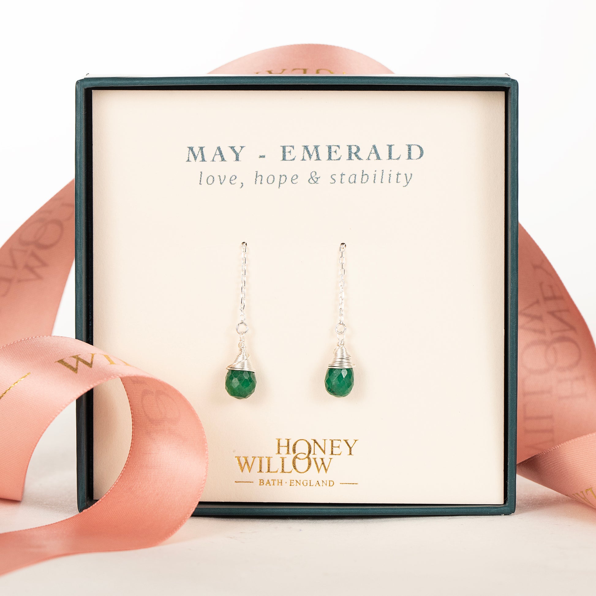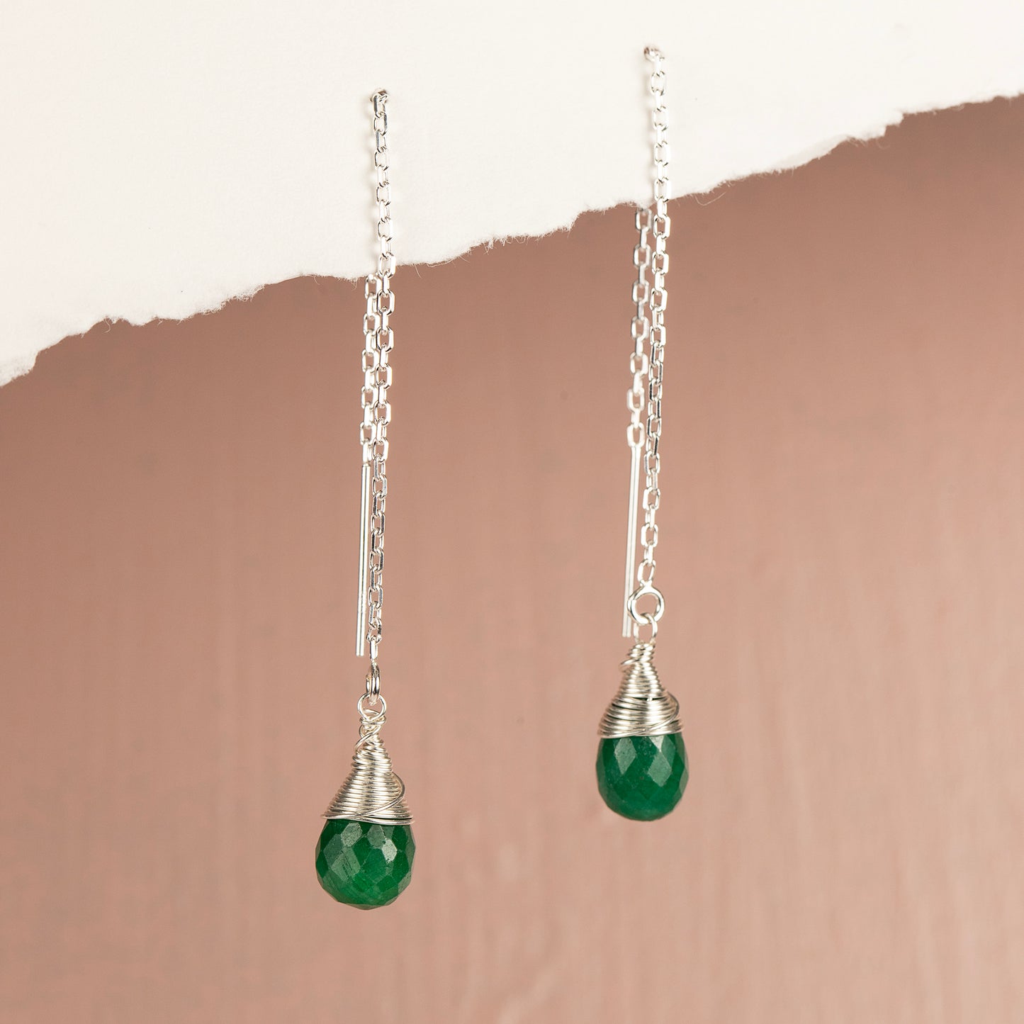 May Birthstone Threader Earrings - Emerald - Silver & Gold
