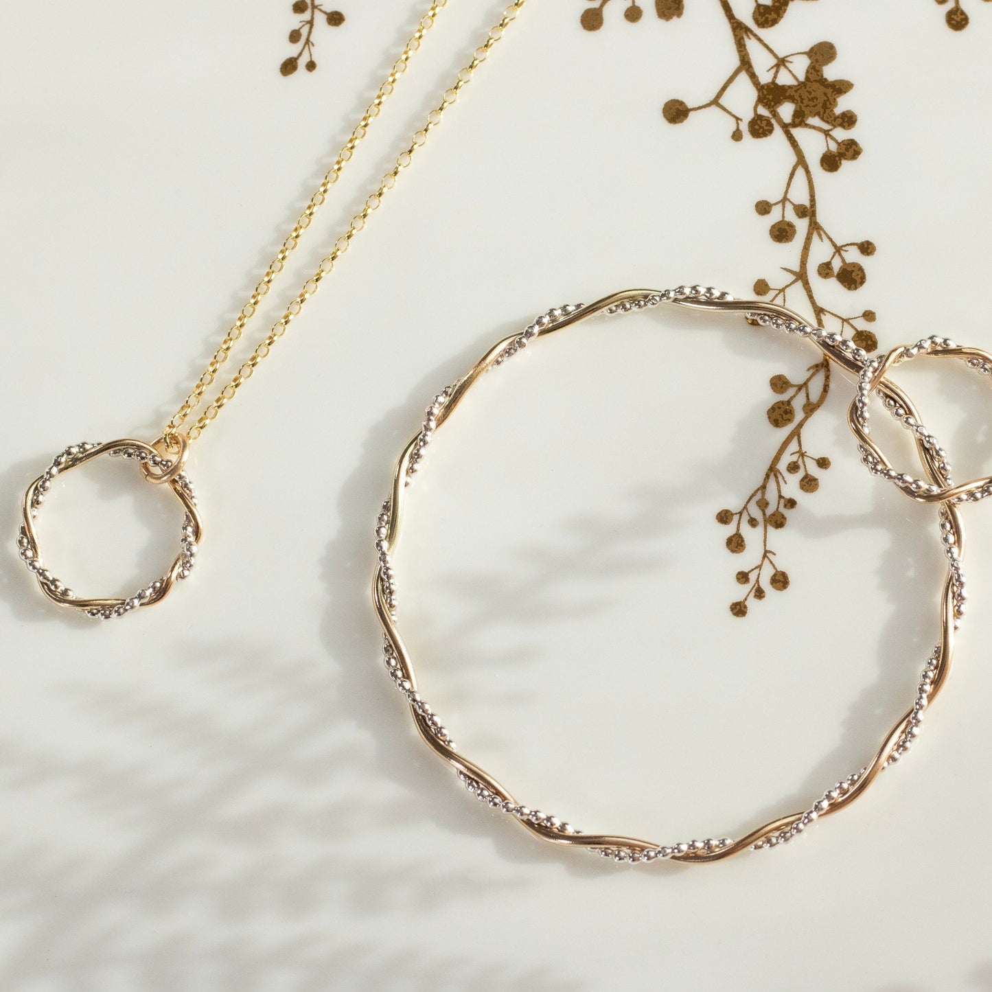Celebrate your bond with a silver and 9k gold entwined bangle, handmade with two lengths of wire, twisted together and linked for a lifetime®.