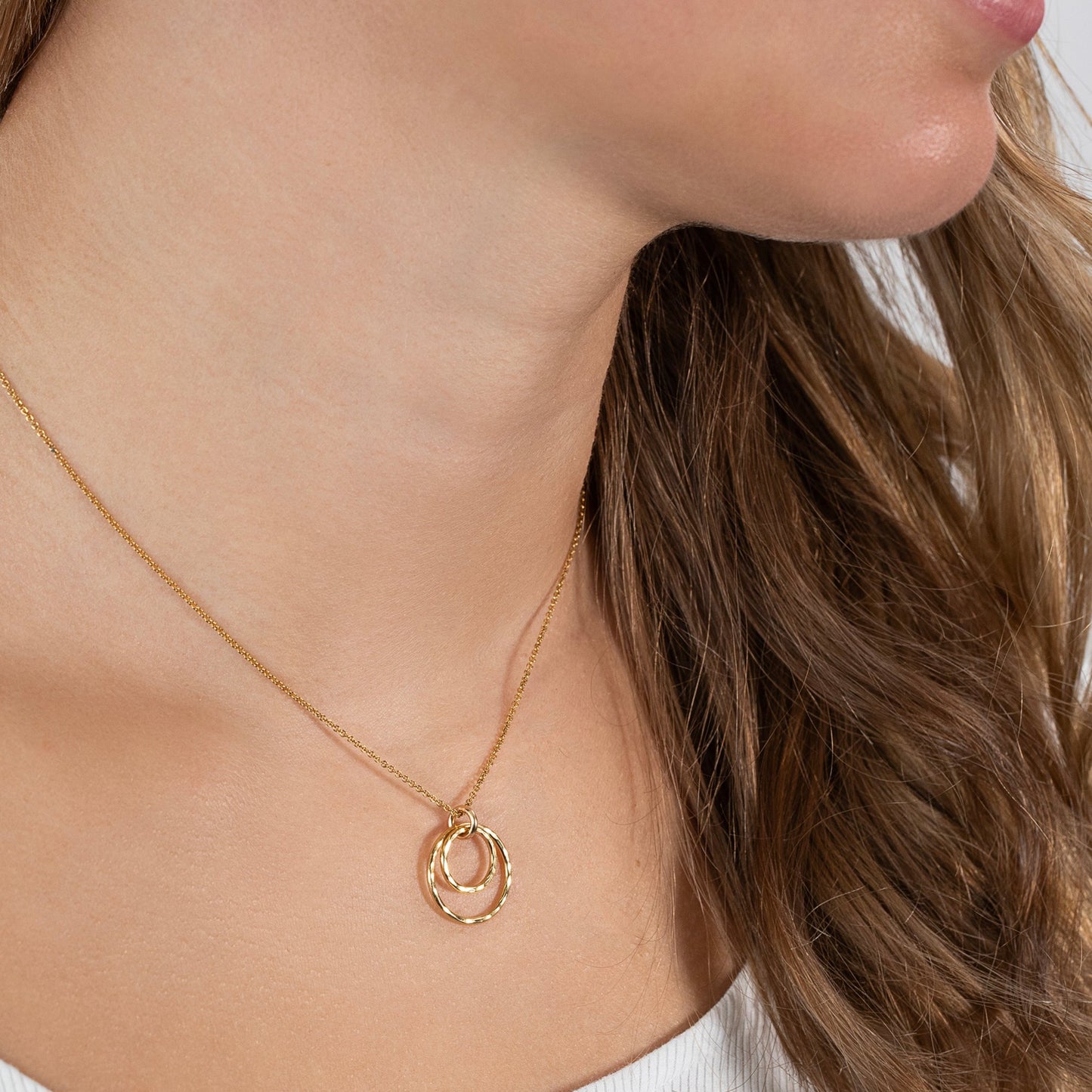 This double circle necklace is handmade with either hammered silver, beaded silver or 18k gold plating over silver.