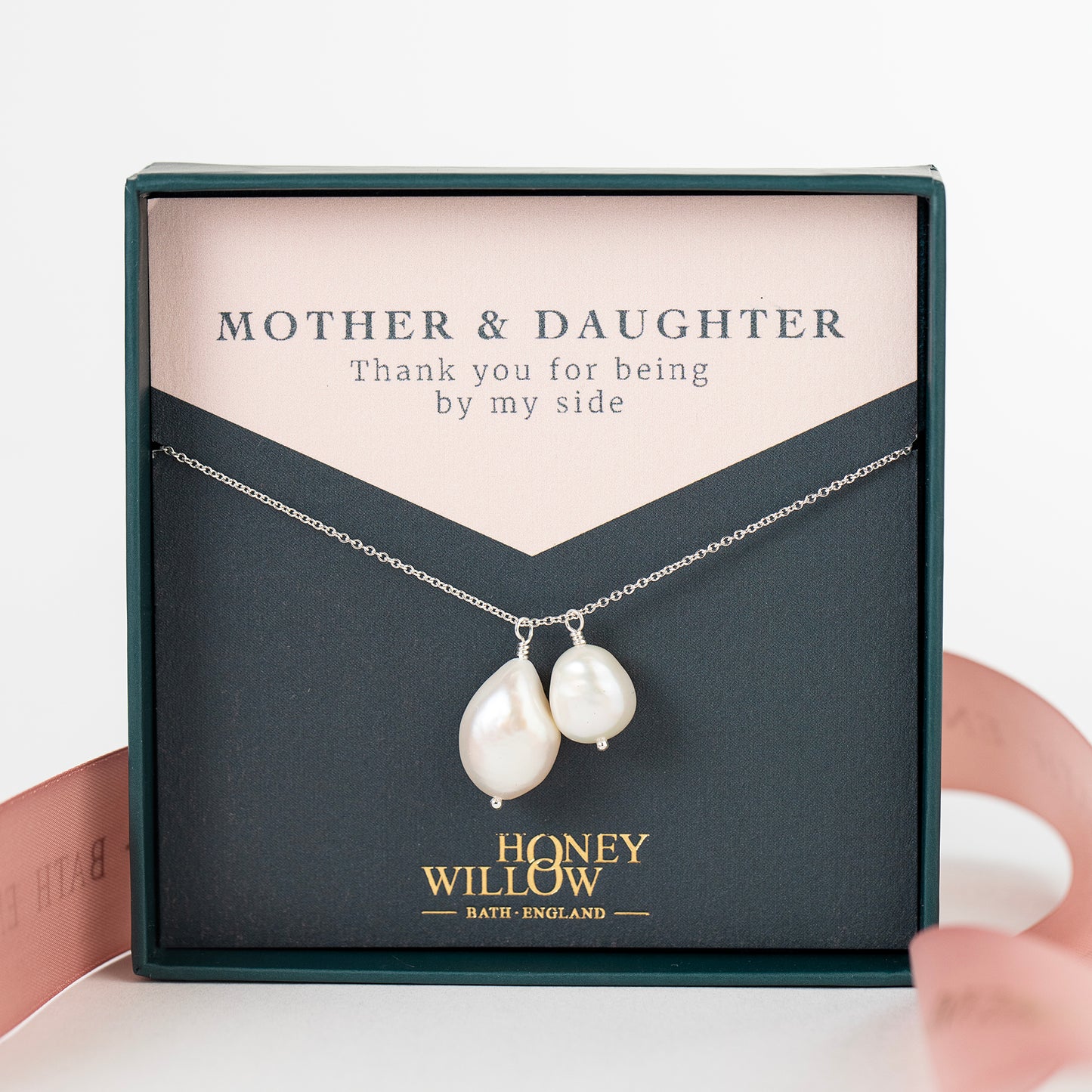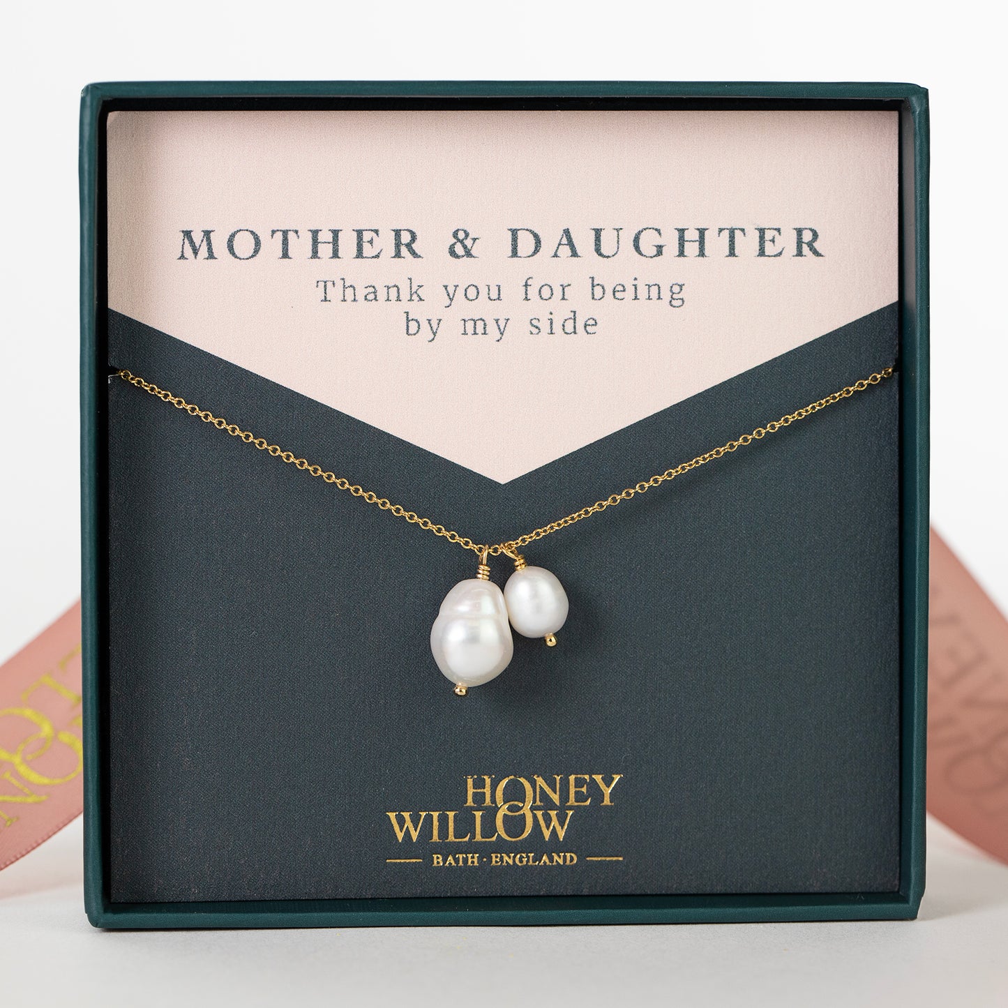 Celebrate your mother and daughter relationship with a double pearl necklace: two pearls side by side.