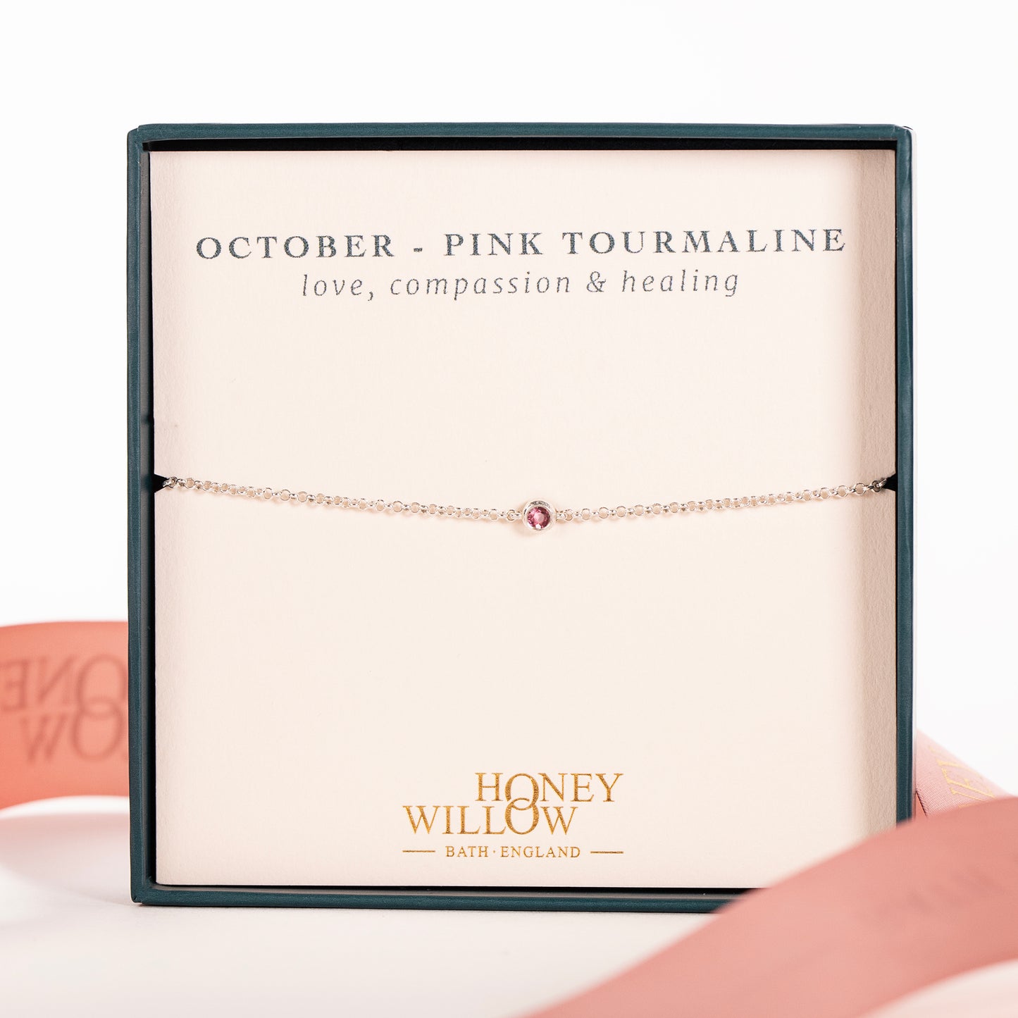 Celebrate her October birthday with a dainty silver bracelet, handmade with a single pink tourmaline.