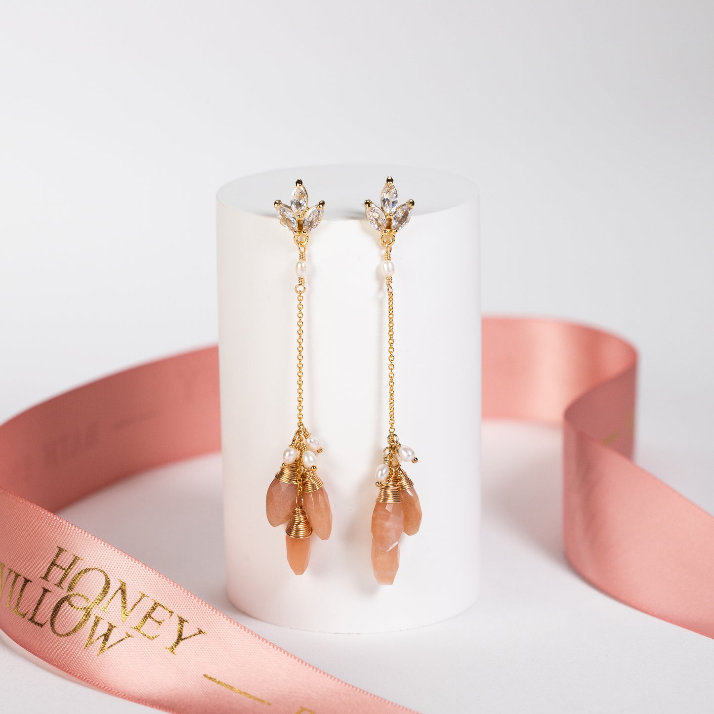 Peach Moonstone Long Marquise Earrings - Silver & Gold - Fleur