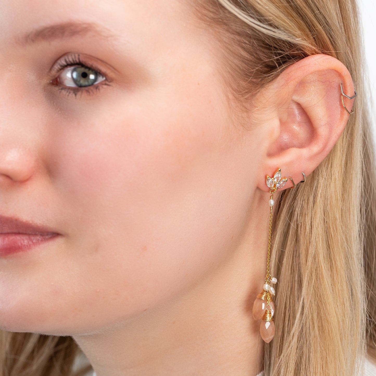 These long dangle earrings feature a cluster of marquise-cut peach moonstones, with freshwater pearls.