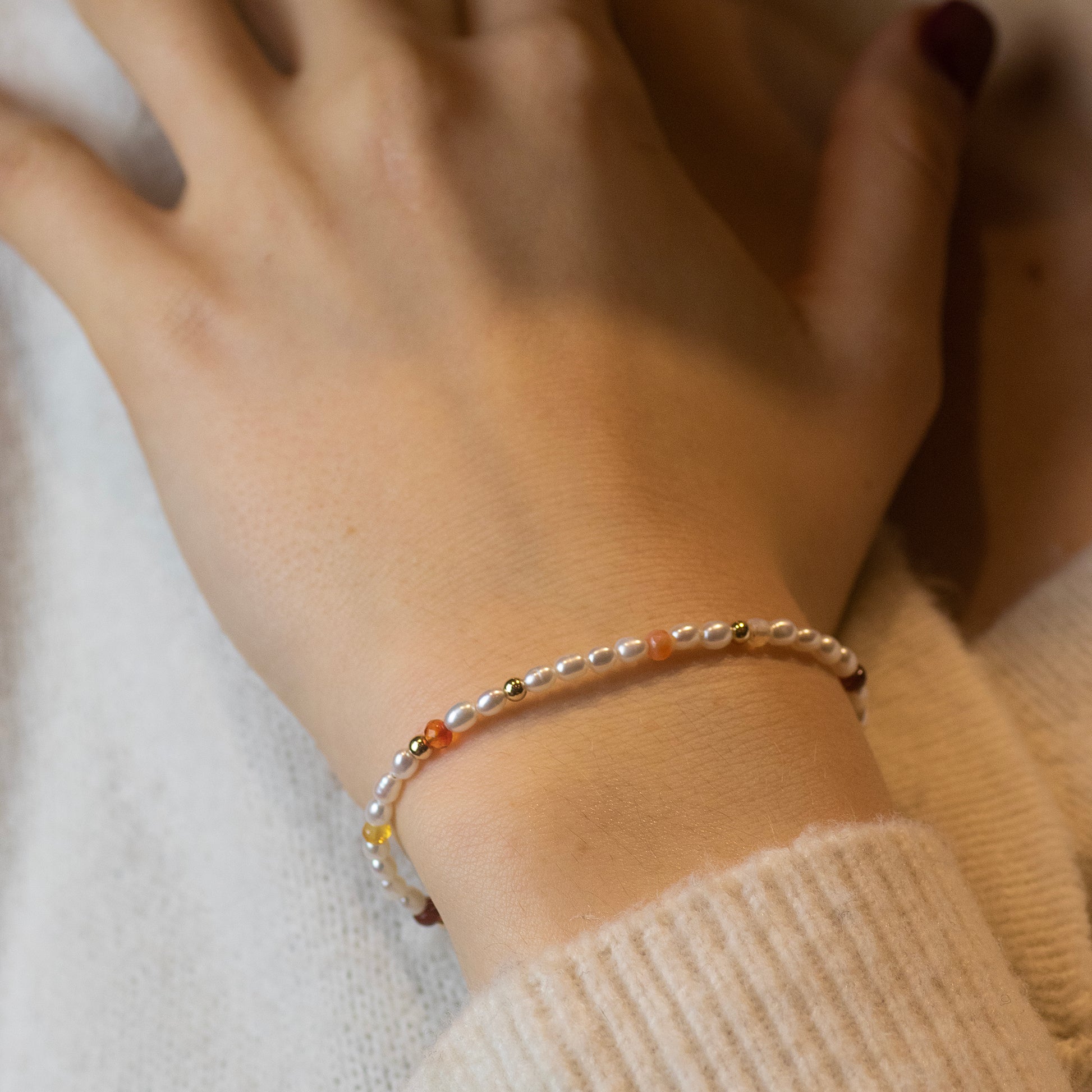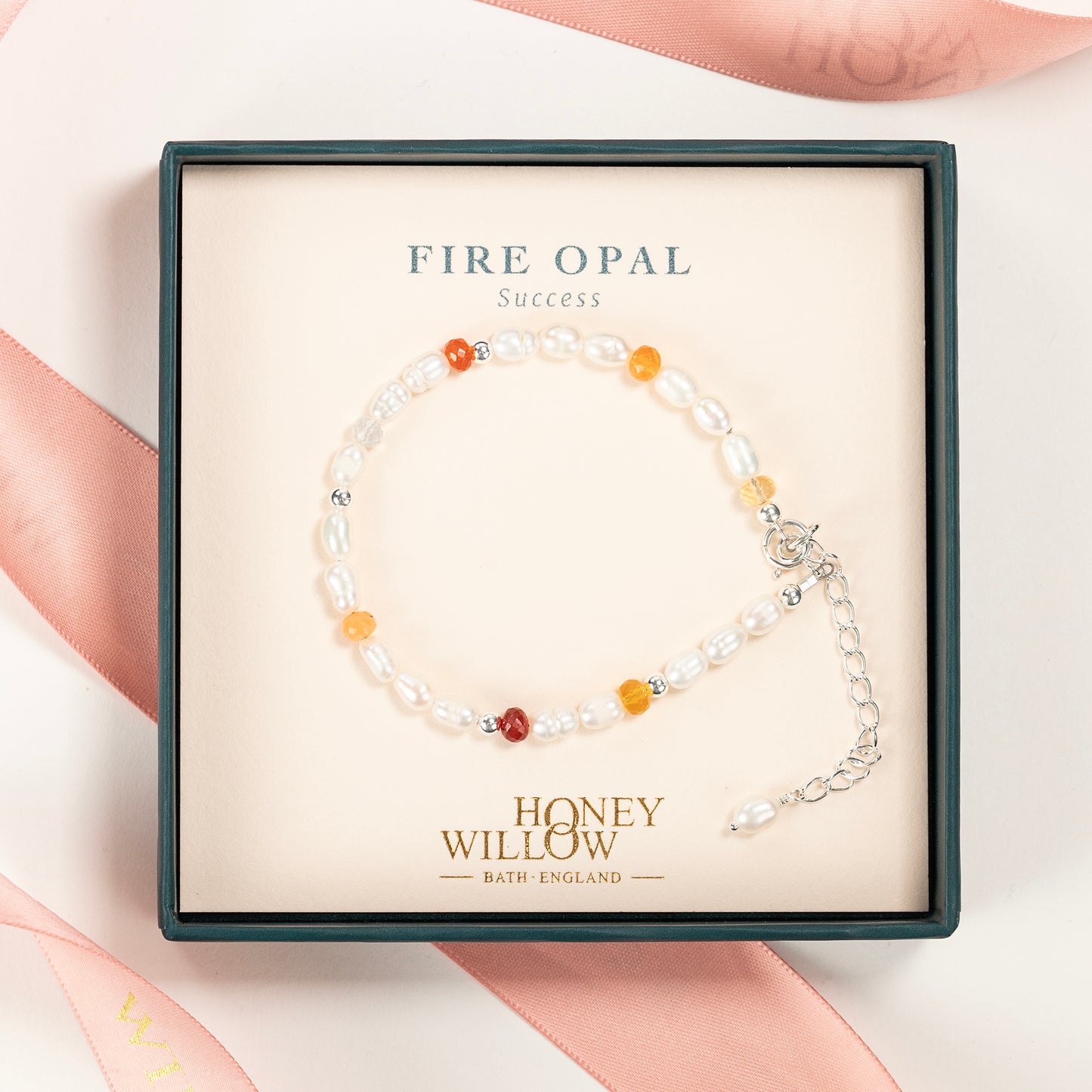 Give her a meaningful gift that celebrates and inspires her. This delicate bracelet is handmade with seed pearls and fire opal stones, which symbolise success.