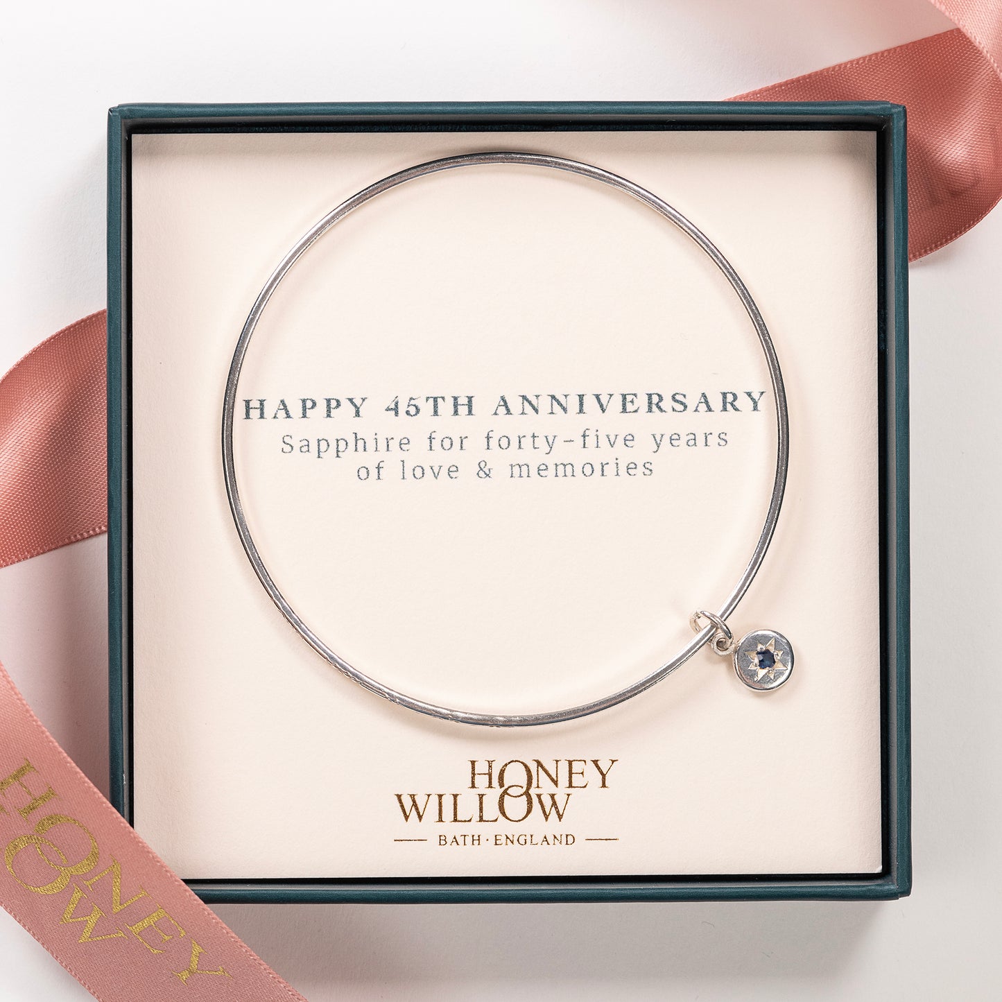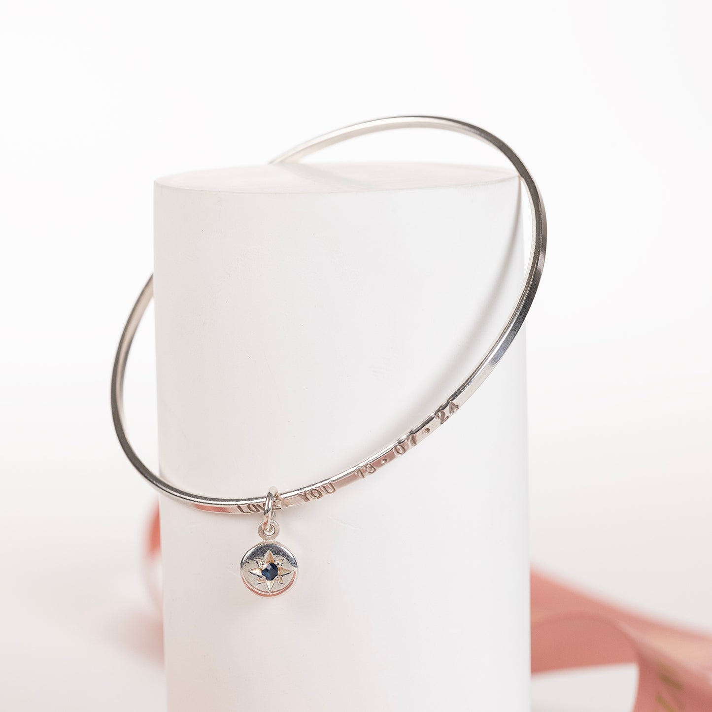 Celebrate your 45th anniversary with a personalised silver bangle, hand-stamped with the name, date or phrase which is meaningful to her. A sapphire is star-set on a tiny charm, representing your sapphire wedding anniversary.
