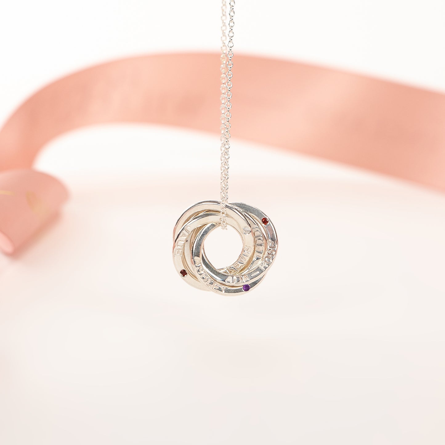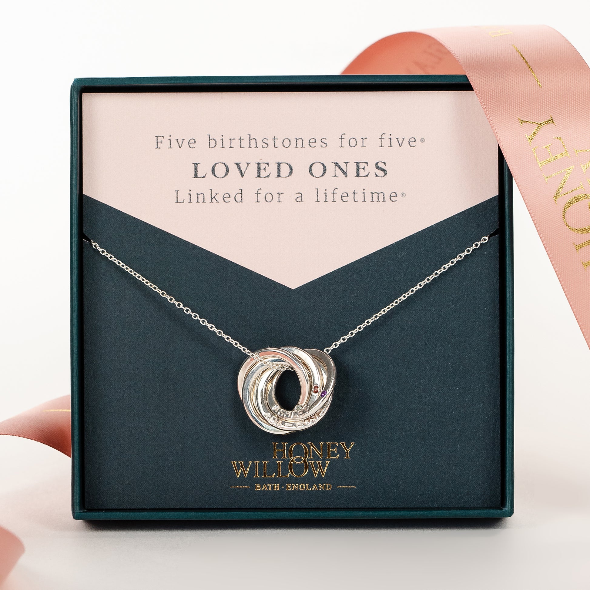 Celebrate her family with a silver five link necklace, each link hand-stamped with a name and set with a tiny birthstone.