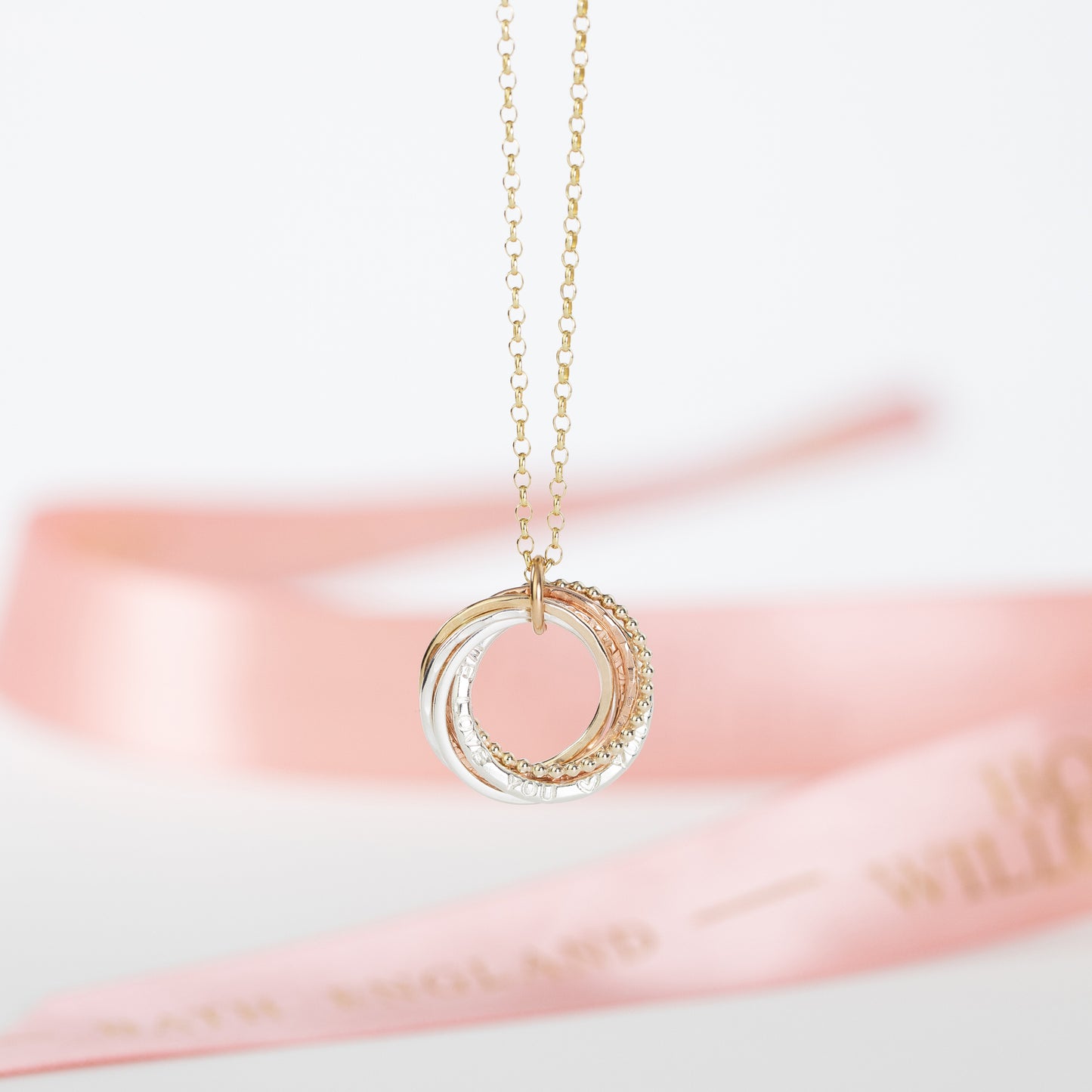 Circles symbolise infinite love, strength, protection and unity. We make her pendant with seven linked circles. One link is hand-stamped with the name, or date or words which are meaningful for her - up to 20 characters.