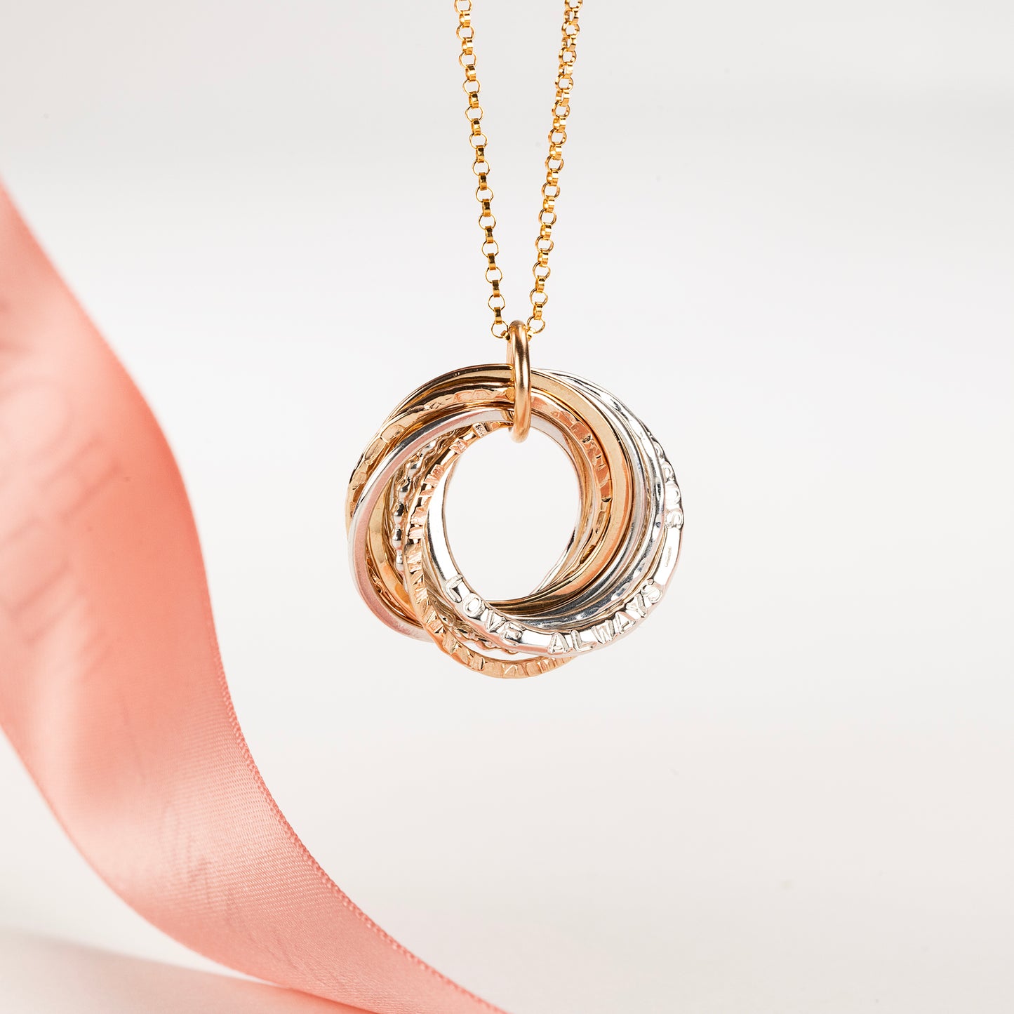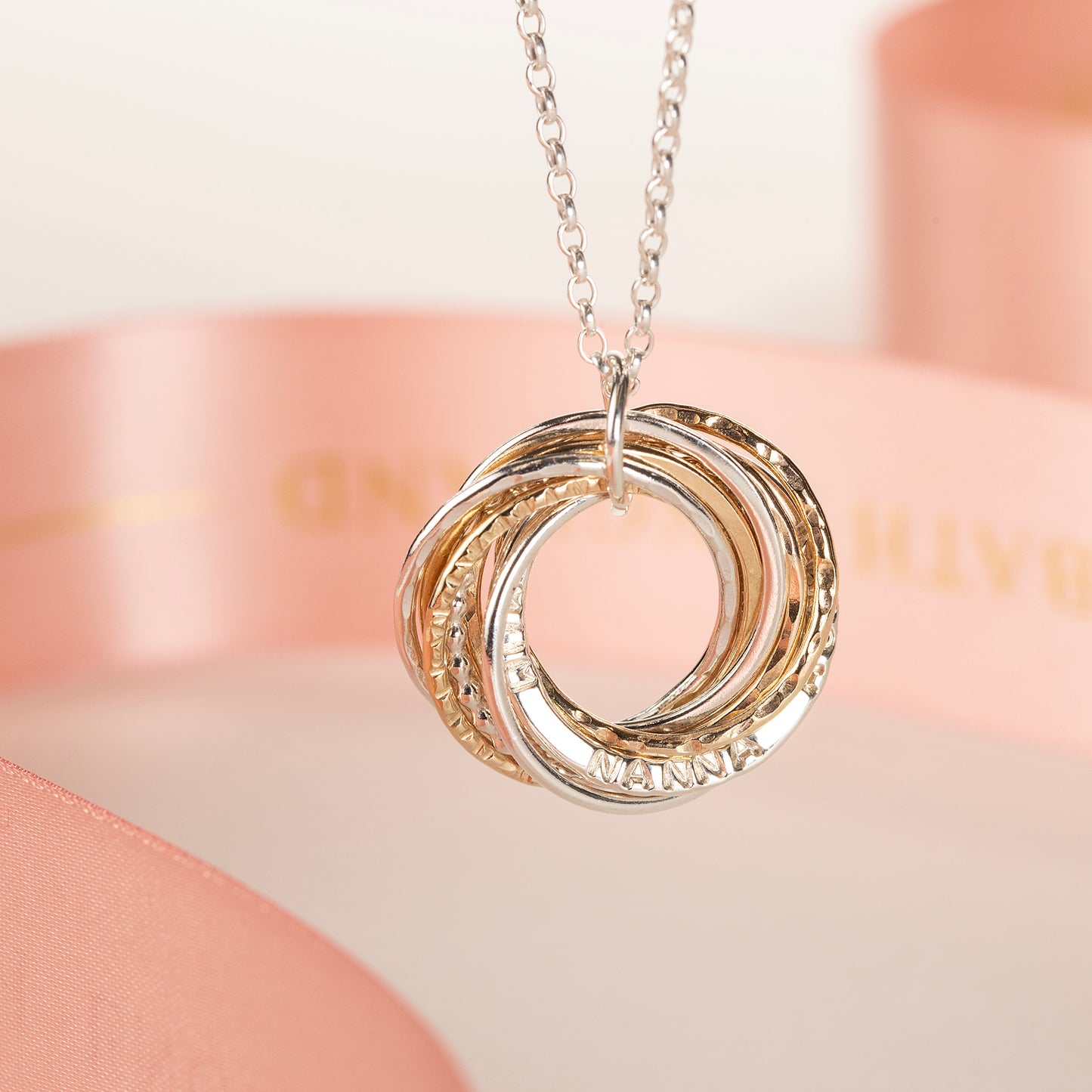 Circles symbolise infinite love, strength, protection and unity. Nine circles are linked to represent her nine decades. One link is hand-stamped with the name, or date or words which are meaningful to her - up to 20 characters.