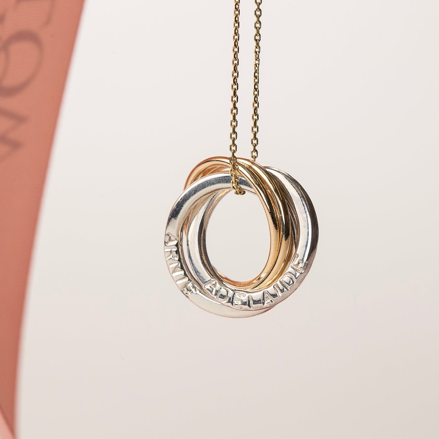 Circles symbolise infinite love, protection and unity. Four circles are linked for a lifetime®. Two silver links are hand-stamped with the name, date or word that is meaningful to her (up to 15 characters per link). They are entwined with two fine 9kt gold links.